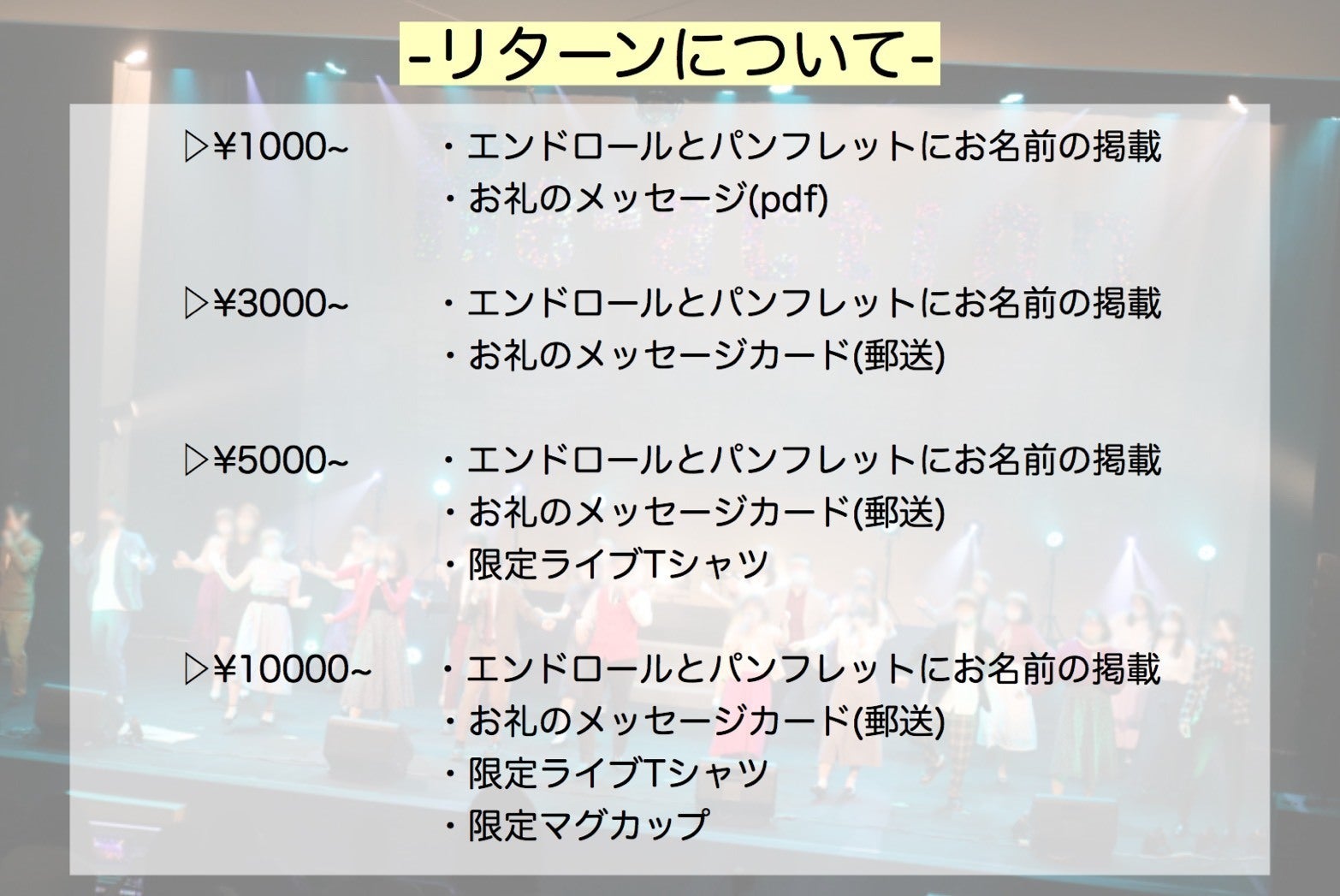 中止の場合、「エンドロールにお名前の掲載」につきましては、2022年1月(予定)に全体曲をサークル員で歌った様子の動画を公開し、動画内最後のエンドロールにお名前を記載させていただきます。「エンドロールにお名前の掲載」 以外ののリターンにつきましては、予定通りすべてお届けいたします。