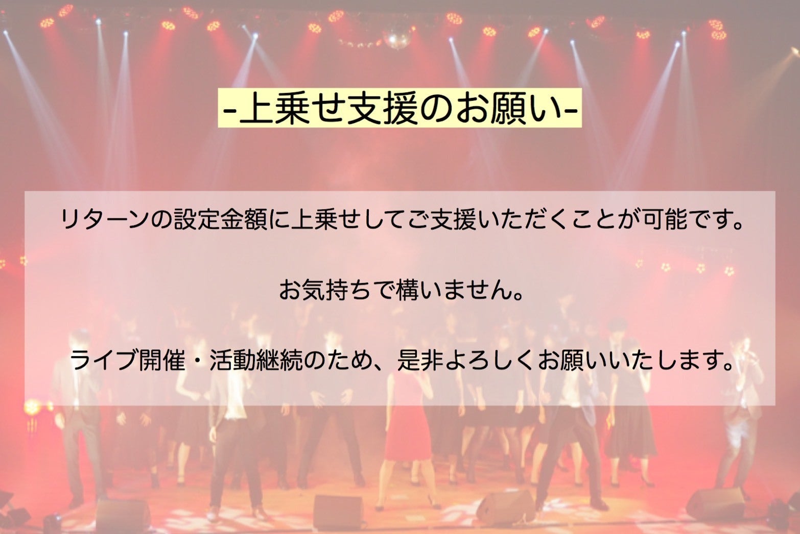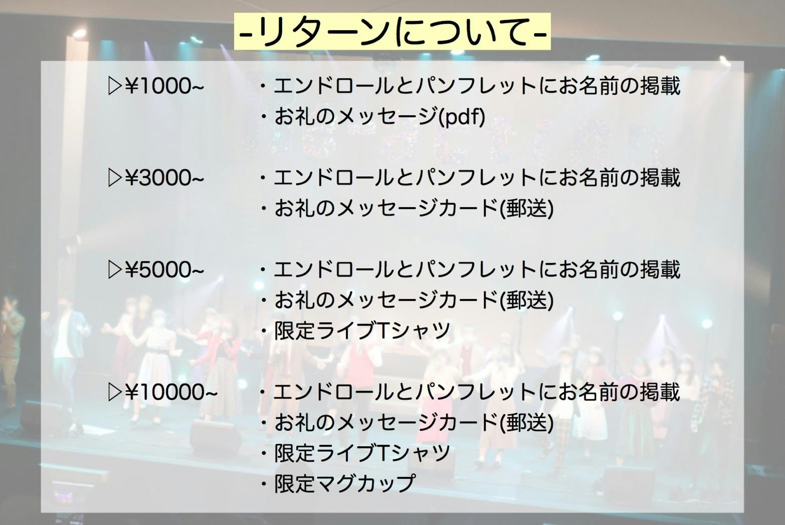 そのような状況の中でも、大好きなサークルとこれまでサークル員として憧れてきたウィンターライブの場を守りたいという想いから、クラウドファンディングを行うことを決定しました。ライブを開催する以上はどのような形であってもお客様に最高のものをお見せしたいという想いに加えて、サークルとして先の見えない中で運営をしていく後輩たちに「繋ぐ」意味のあるライブにしたいという想いを持っています。サークルライブの成功と、それを通じたサークルの維持・活性化のため、ご支援いただけると幸いです。
