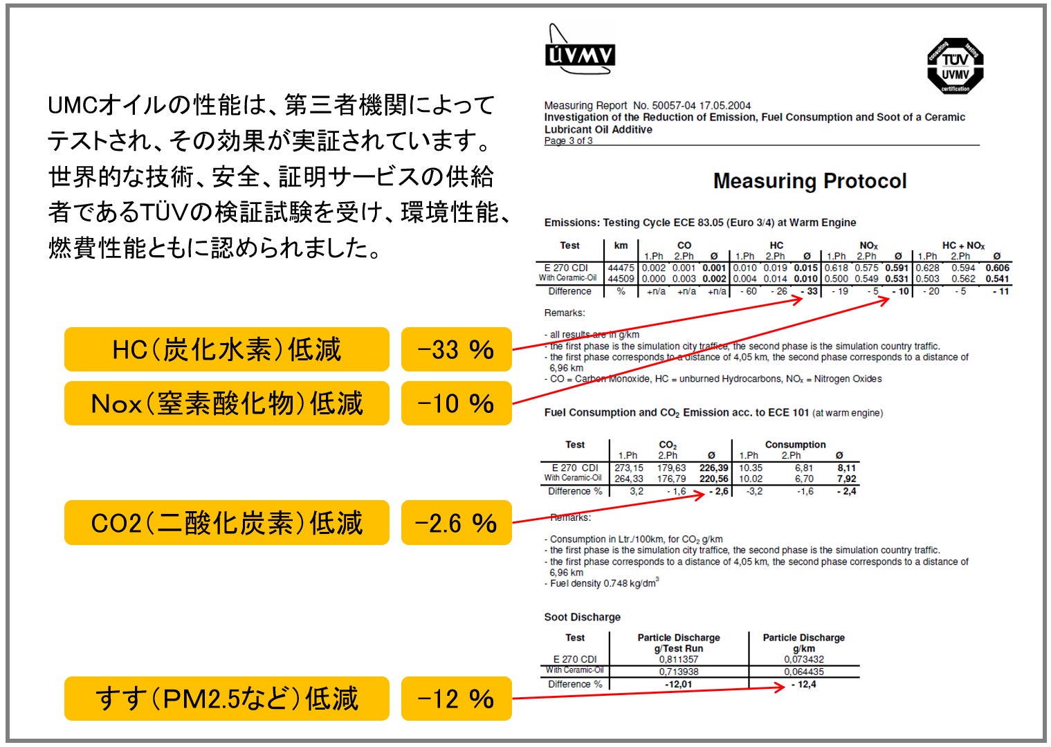 このUMCオイルをエンジンオイルに添加すれば、CO2(二酸化炭素)・HC(炭化水素)・Nox(窒素酸化物)などを低減することができます。