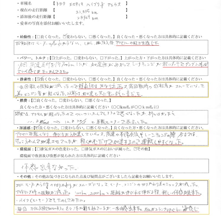 体感として、エンジン音が静か、振動がなくなり安定、などの変化を感じられるとのお客様の声をいただいております。