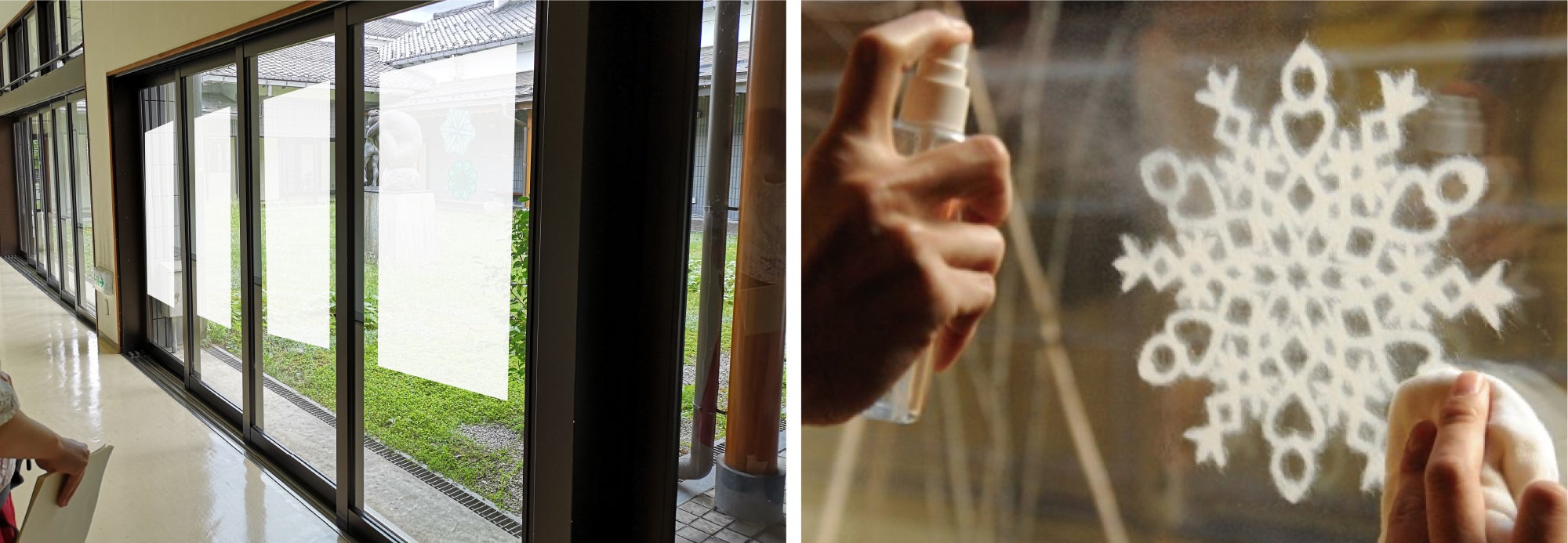入り口を入った正面のガラスを使って、地元の学生などにお手伝いいただきながら、雪カタチをした和紙で花を咲かせます。(内容は変更となる場合があります)