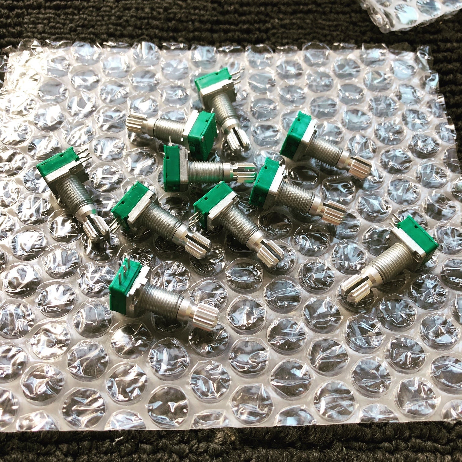 本日は電材屋さんからの部品が到着した為、いよいよ基板の生産に着手いたしました! 最近は半導体を含む電材の世界的な流通不安から、電気部品の値上がりや、欠品などが目立つようになってきました。とはいえ、今回使用する部品はまだまだ流通在庫が豊富な物のみを取り扱いますので、それほど調達が困難というわけではありません。調達が困難(というか中々進まない)なのは以前の活動報告に書かせていただきましたゲインコントロールポットのみの感触ですが、もしかすると同梱するステレオジャックあたりも調達が怪しい所です。。 ポットとそのごく一部近くにある部品を除いて54台分の基盤を組み立ててみました。 因みに作業効率の関係から、1枚9台分の回路基板を分割する前に部品を実装しています。 これだけで約1日ぶっ通しで作業をしていまして、並べてみるとかなりの手ハンダ数です。 組み立てのごく一部ですが、動画にしてみました。 正直この作業はハンドメイドらしく無茶苦茶に時間が掛かり、精神的な消耗もかなりありました。まだ残りの台数の作業は現在随時作業中です。 さて、今回、音質に直結するフィルター用のコンデンサはメタライズドポリエステルコンデンサを採用する事にしました。(黄色い四角い部品の事) これはFaithful Link社のフィルムコンデンサで、無誘導構造、自己修復性、小型を特長とします。ケースに入れエポキシで充填してあるため、耐湿性があります。特性がよく、ひずみ(いわゆるギター的な意味ではなく電気的な意味)も少ないので、オーディオ回路に最適な部材の一つとされています。 そこから考えると楽器に封入するには最適な選択なのではないかと思い採用に至りました。トップ画像のサンプル品に使用したコンデンサは自分で所有していた所謂デッドストック品であった為、変更しましたが、音質的、組み立て作業的にも、この選択は正解だったと感じています。 所謂エレクトリックギター類の楽器向け電気回路は、音質という理屈では説明しきれない所がありますが、正解と不正解(勿論回路的には安全な設計をしています)の境界線、そのどこかに心地よい音質が存在するのではないかと個人的には考えています。