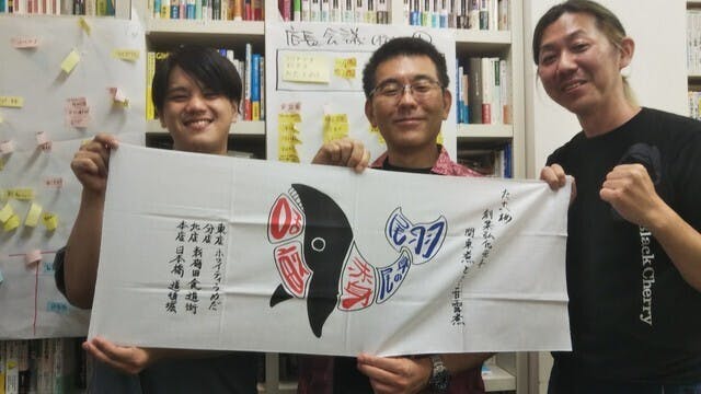 スタッフ 谷口(左) 5代目店主 岡田哲生(真ん中) たこ梅本店店長 和田(右)