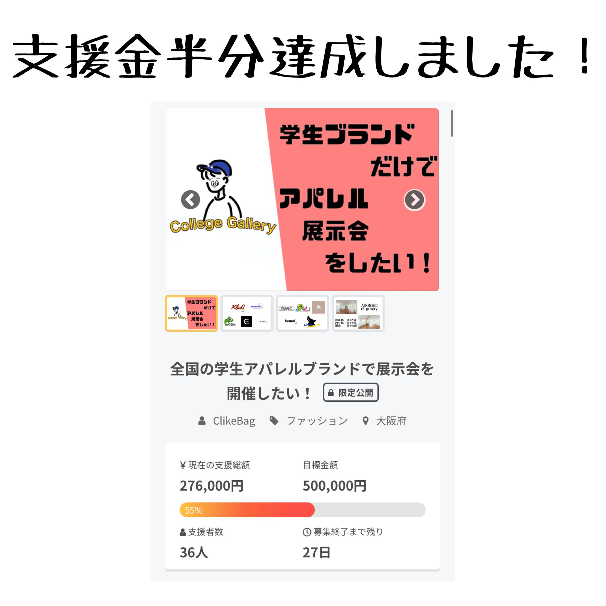 目標金額の50%を超えることができました。