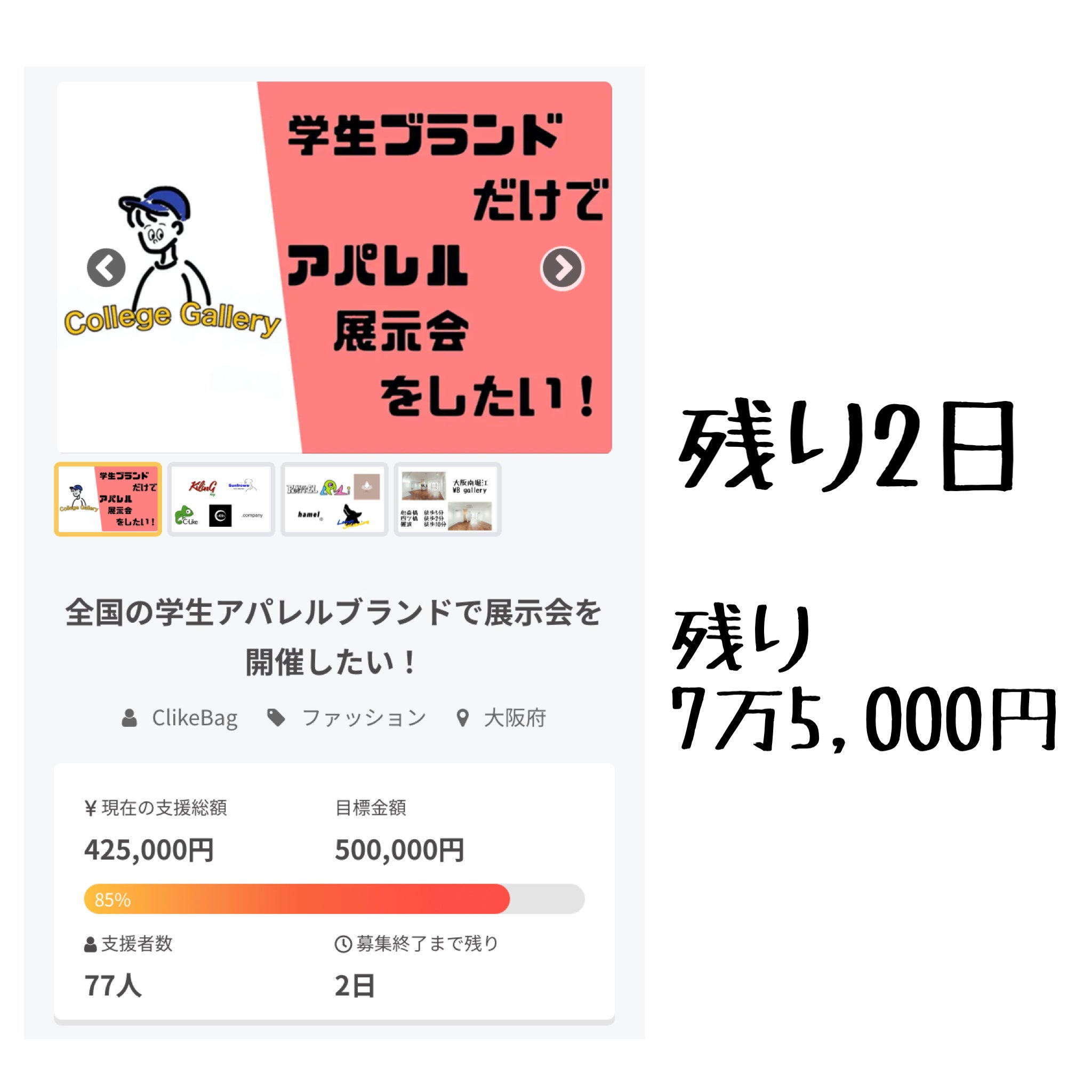 残り金額75,000円まできました!!!