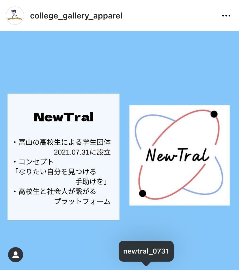 学生団体NewTral様からご支援をいただいております。学生団体NewTralは富山の現役高校生による学生団体です!!2021/07/31に立ち上げられ「なりたい自分を見つける手助けを」 をコンセプトに複数のイベントを開催!!高校生が自分を知ることで未来を考えるきっかけ作りと、高校生と社会人が繋がるプラットフォームの形成を目指す活動を行う。活動実績・富山学生構想会議・ディベート交流会・自己分析イベントインスタグラム⇨【クリック】高校生でありながら学生団体を立ち上げ、運営するの凄すぎます(涙)大学生、専門学生である私たちにとって尊敬しかありません!!!!この度はご支援ありがとうございました!!!