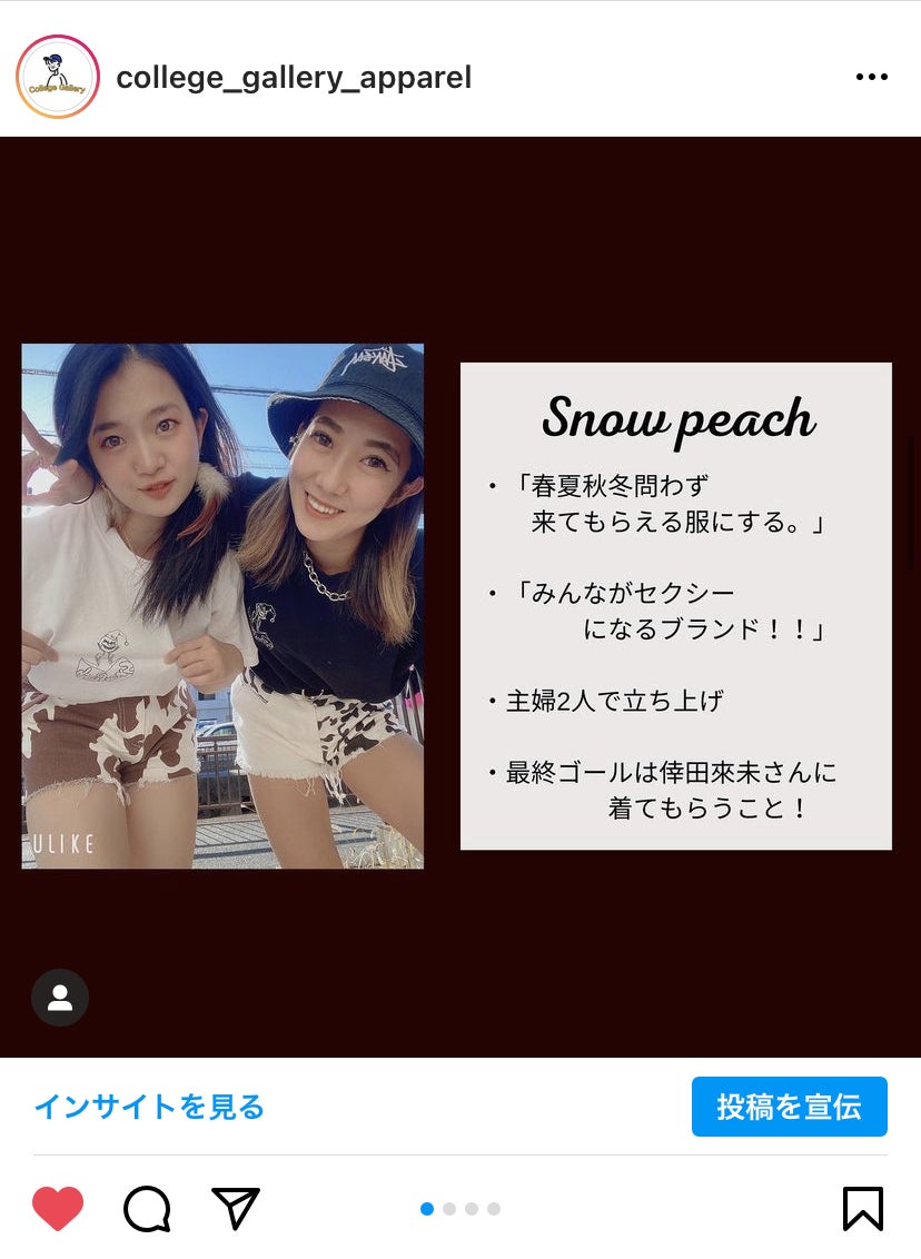 この度「Snow Peach」様から応援していただきました!!Snow Peachさんは主婦2人で立ち上げたブランドです!!「春夏秋冬問わず着てもらえる服にする。」「みんながセクシーになるブランド!!」をコンセプトにアイテムを作成しています!!最終ゴールは倖田來未さんに着てもらうこと!!届けーーーーーーーー!!!!学生の私たちにとって少し大人なブランドです!!!大人の一歩に笑販売サイト⇨【Snow Peach】Instagram ⇨【Snow Peach】 TikTok ⇨【Snow Peach】オンライン上でのお話しありがとうございました!!学生一同感謝しております!!今後ともよろしくお願いいたします。