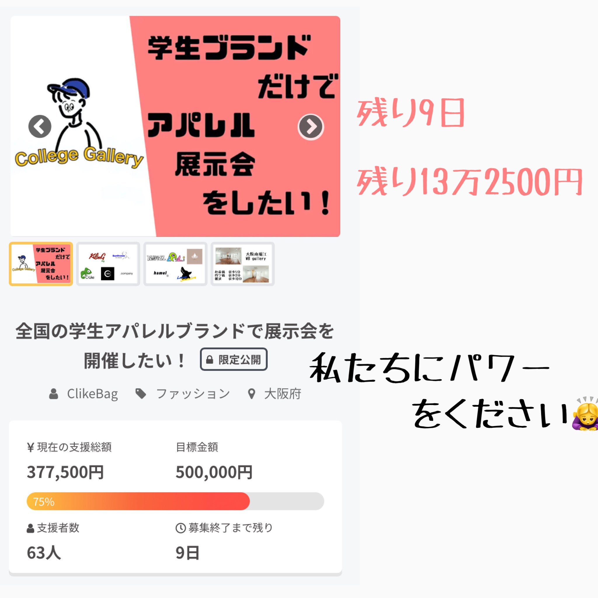 今日で公開から2週間経ちました!!公開してから1週間くらいはずっとソワソワしていましたがそのソワソワ感が今は無くなって少し慣れてきています!!しかし、、、、日にちが過ぎることに焦りも、、、、、支援の数がなかなか伸びない状態が続いています!残りの期間で絶対達成したいのでなんとかメンバー一同頑張っている状態です!!どう頑張っているのかと申し上げますと!!直接応援して欲しい連絡をしています!!!!たくさんの方にお声がけさせていただいております!!嬉しいことにSNSのやり取りの中で支援すると言ってくれる方も増えてきている状態です。残りの金額も同じように支援者を増やしていこうと思っております!!!!