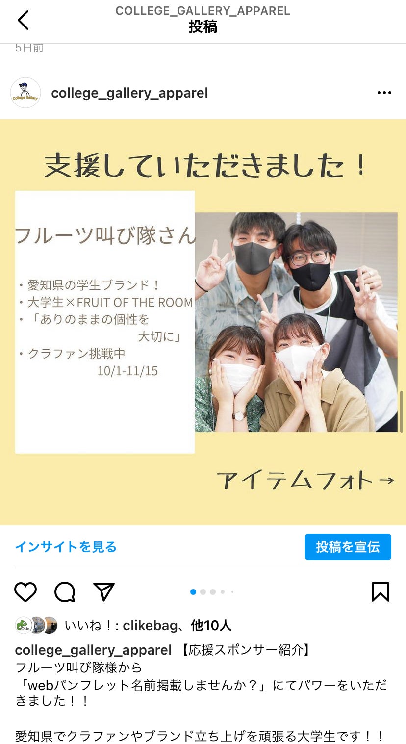 本日から【WEBパンフレットに名前を載せてみませんか?】の支援者の方を紹介していこうと思います!第一発目はフルーツ叫び隊さまから支援いただきました。今回College Galleryの一番最初の支援者です!!始まりはフルーツ叫び隊さまからと言っても過言じゃありません!!フルーツ叫び隊さまは愛知県でクラファンやブランド立ち上げを頑張る学生です!「ありのままの個性を大切に」をコンセプトにアイテムを作成してます!!有名ブランドとコラする異色のブランド!!!インスタグラムはこちら⇨【フルーツ叫び隊】アイテムサイトはこちら⇨【販売サイト】画像をクリックで商品サイトに飛べます!!(11/15まで)ぜひチェック!!!!