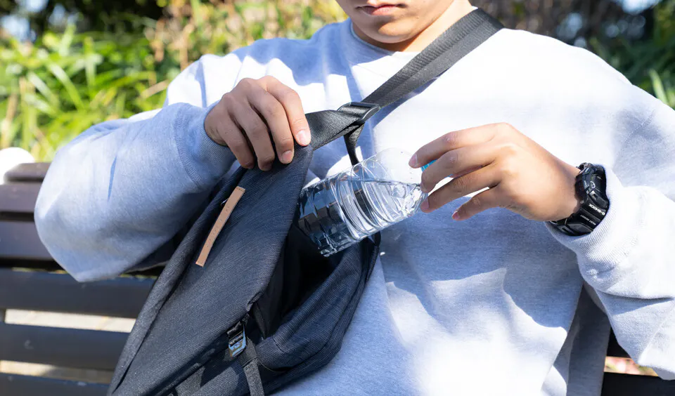 バッグの側面から簡単にアクセス可能。左右どちらからでもアクセスしやすく、利き手を選ばない仕様です。