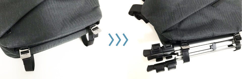 バッグ下のストラップで三脚などを固定することも可能です。