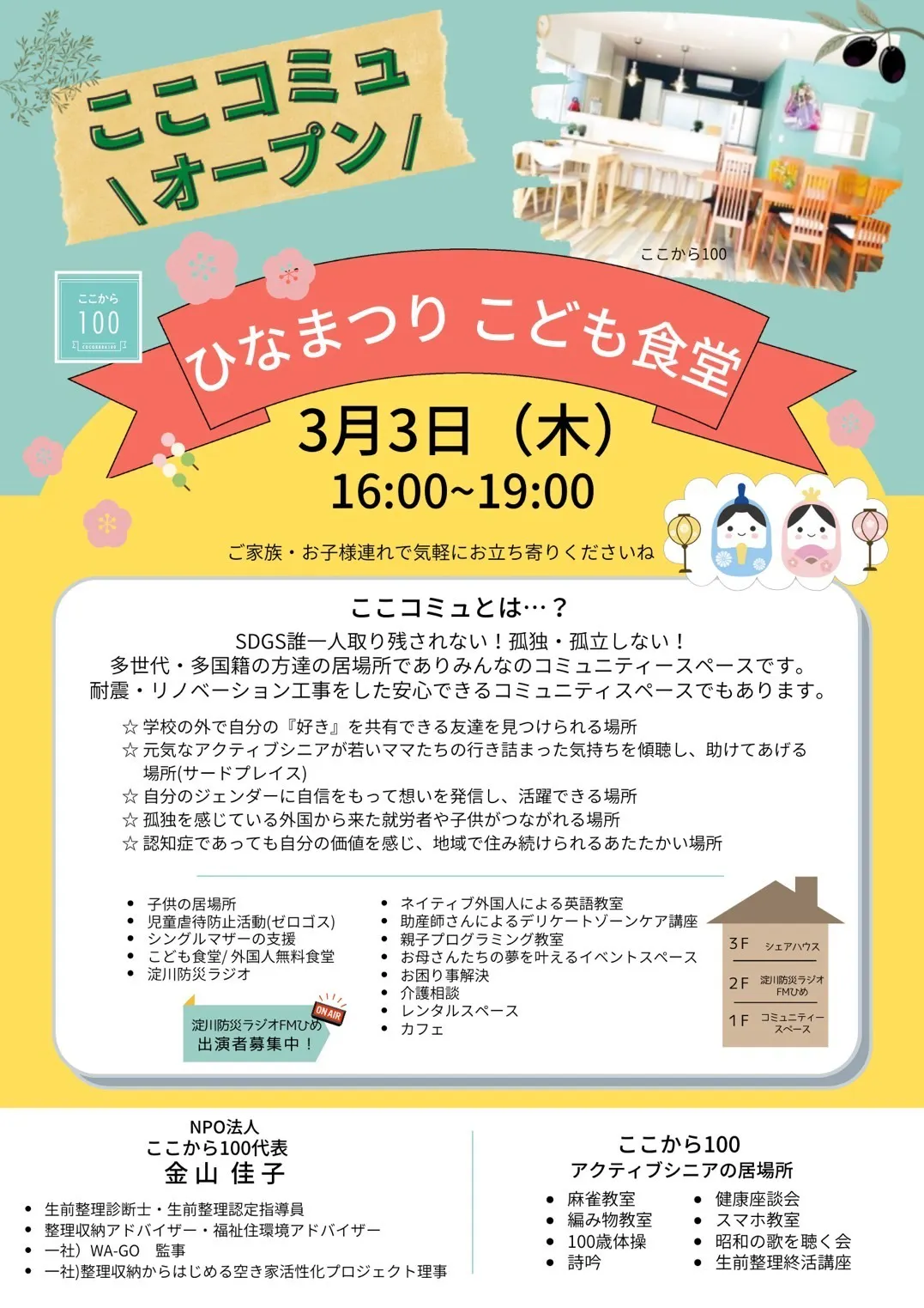 2022/02/28 21:223月3日(木)ひなまつり・クラウドファンディング残りあと3日となりました。目標金額50万 支援者80名になりました。本当に感謝・感謝でいっぱいです。ありがとうございます。世界情勢は、ロシアとウクライナの戦争により民間人・こどもたちが犠牲になっています。今回のクラウドファンディングの中から、みなさんの気持ちと一緒に在日ウクライナ大使館・国際NGO ADRAウクライナに食料と水・寄付金を送金致します。一日も早く平和がくることを祈っています。3月3日(木)こども食堂(木曜日)淀川区十八条2-15-1 ここから10010時半から15時まで ちらし寿司を作ります。淀川区東三国6-12-15 ここコミュ 16時から~なくなり次第終了テイクアウト こども 無料 大人 500円(お菓子付き)ボランティアできるかたお待ちしています。 もっと見る