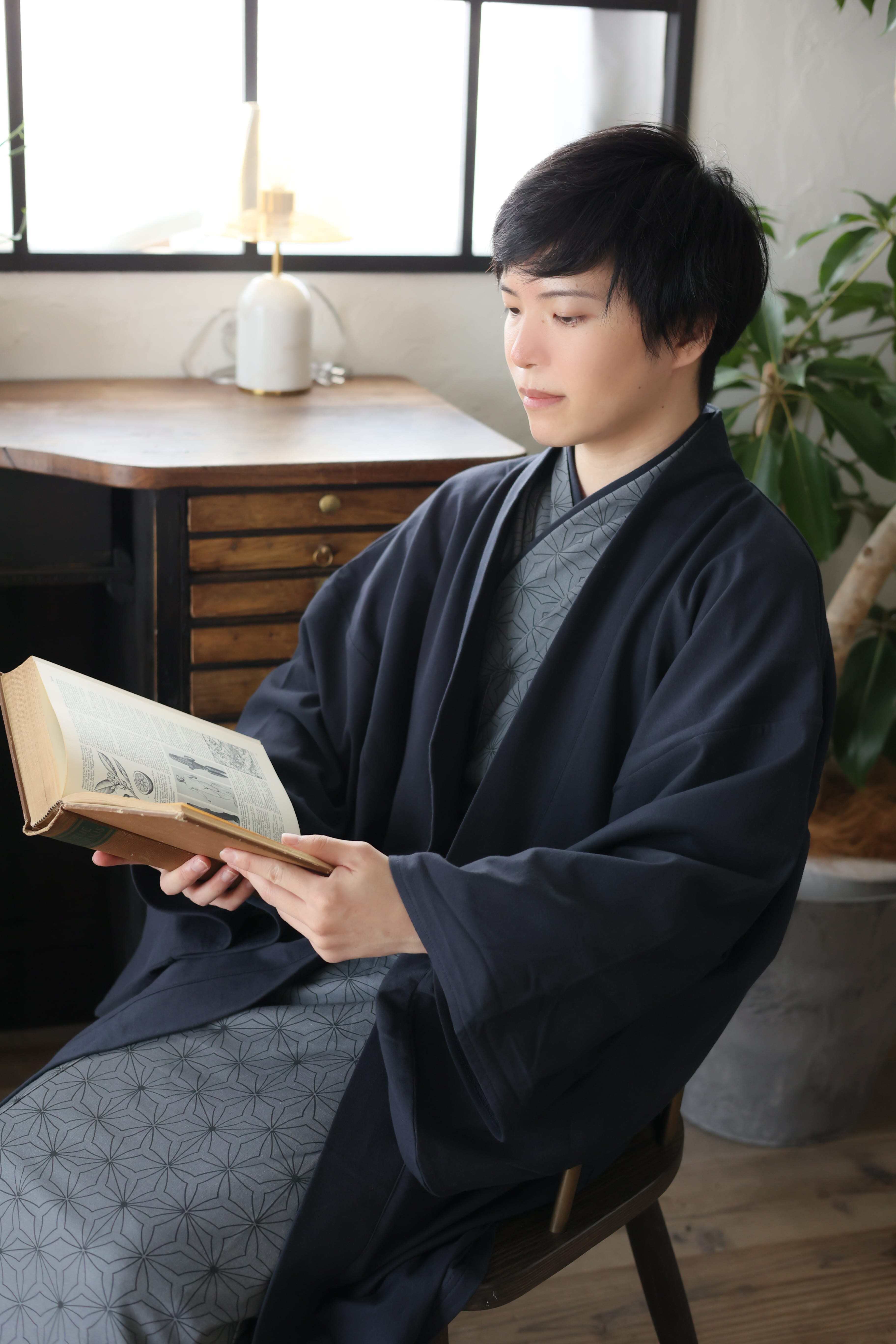 小柄でさりげなくシンプルにまとめました。羽織は紺で締めて正統派なイメージに。