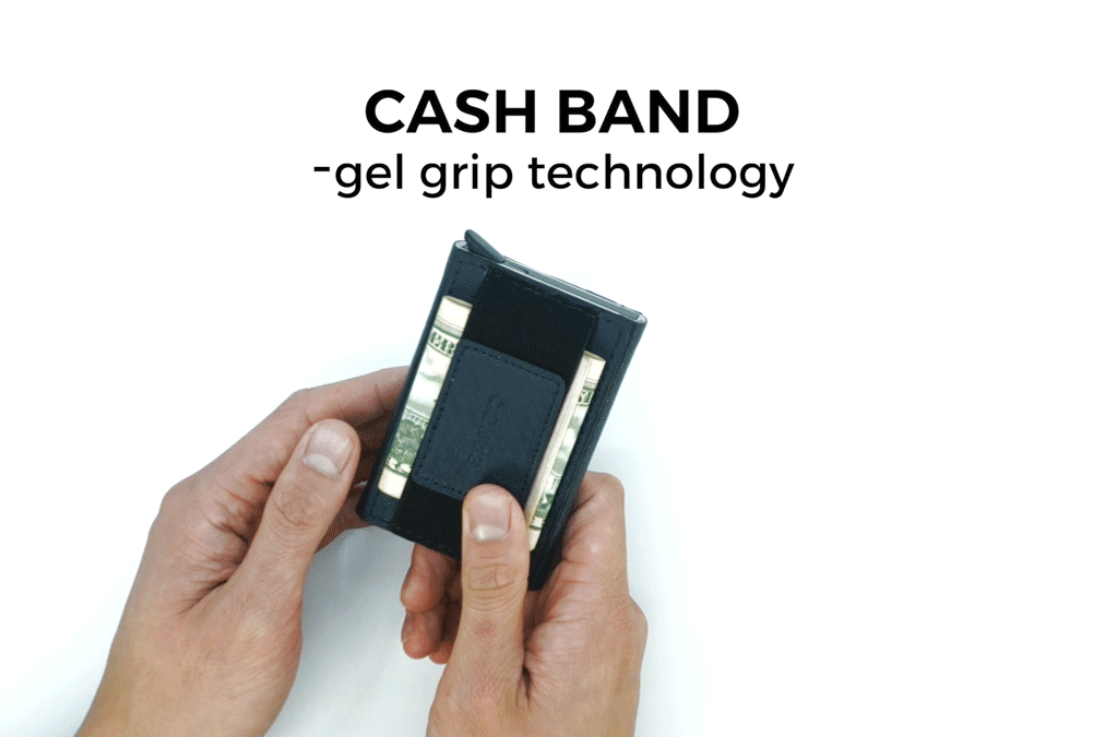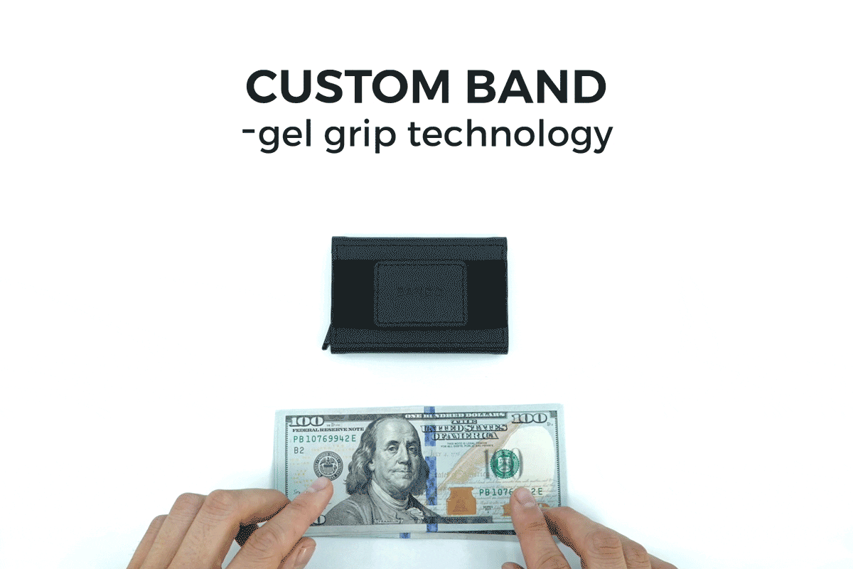 バンド裏側に滑り止めのゲルグリップ加工を施しました。少ない枚数の紙幣も滑り落ちずにしっかりと挟むことができます。