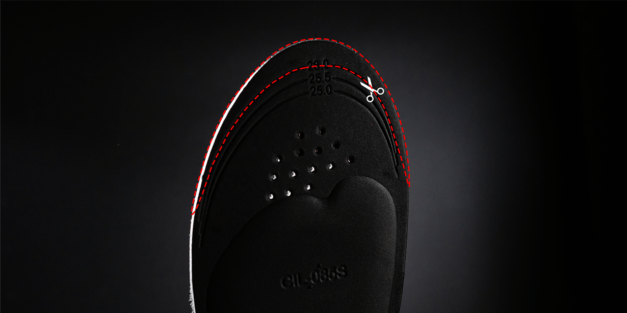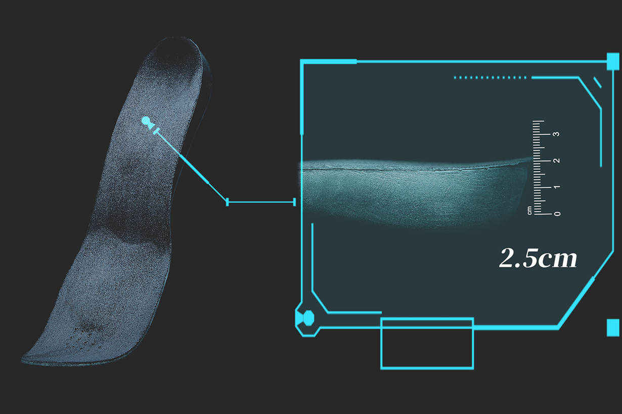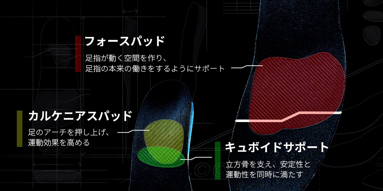 メダリスト愛用のインソールメーカーBMZ社と共同開発、2.5cm厚底ソールをかかと部分に設計。