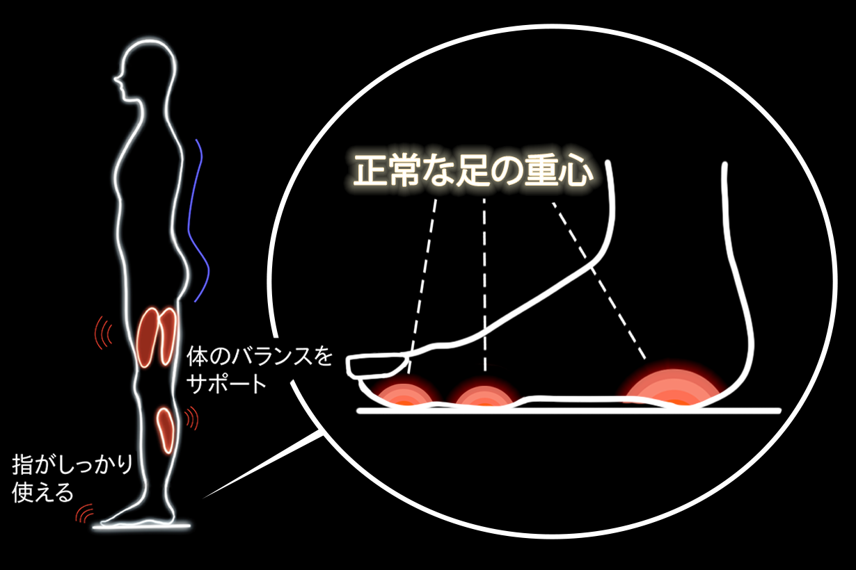 よって、指の付け根、かかとに重心が偏ってしまい、