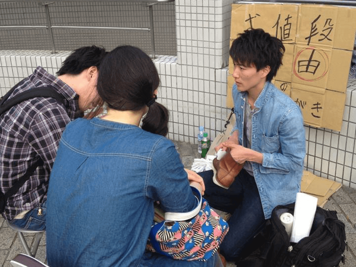代表の水谷は、学生時代から起業することに憧れを持ち、 自らできることとして、商売人の原点の路上にて、靴磨きをしていました(19歳の頃)