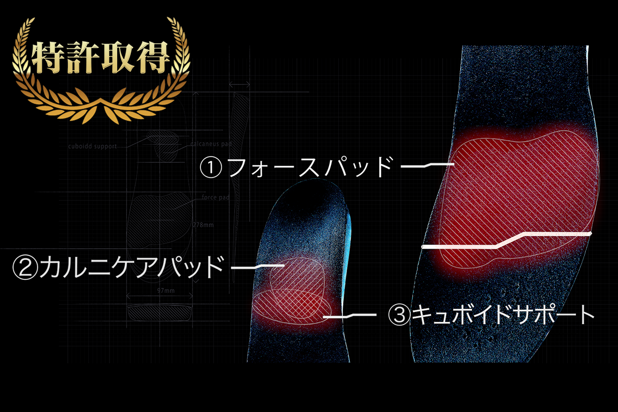 さらに、国際特許を含む、3つの特許技術をインソールに採用。