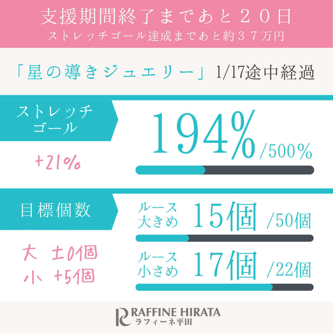 \あと4日でクラファン終了!/あっという間にあと4日になってしまいました…!11月19日にスタートした「星の導きジュエリー」プロジェクト。時が過ぎるのは早いですね。現在、359%到達!目標の500%まであと141%、個数換算するとルース大×16個 、ルース小×3個で達成できます!「スマホが苦手で支援の仕方がよく分からないの」「直接お店に行って支援金を渡してもいい?」というお客様がいらっしゃいましたので、プロジェクト担当の方に許可を頂きました。店頭での支援購入予約のお知らせラフィーネヒラタ新前橋店・ラフィーネヒラタ荒牧店両店で、店頭での支援購入予約を受け付けます!①店頭へお越し頂き、「星の導きジュエリーの支援をしたい」とスタッフへお伝えください。②申込み用紙に記入し、代金をお支払いください。 ※別途決済手数料220円がかかります。 ルース小の場合→4,950円+220円=5,170円 ルース大の場合→9,900円+220円=10,120円③2月中旬から順次お届けします。【ラフィーネヒラタ 新前橋店】〒371-0831 群馬県前橋市小相木町552-1TEL 027-252-8828営業時間 AM 10:00~PM 7:00定休日:水曜日(祝祭日の場合は営業しております)アクセスマップ:https://goo.gl/maps/xoxB2CjKT7jbmCvx6【ラフィーネヒラタ 荒牧店】〒371-0044 群馬県前橋市荒牧町1-10-14TEL 027-260-1377営業時間 AM 10:00~PM 7:00定休日:水曜日(祝祭日の場合は営業しております)アクセスマップ:https://goo.gl/maps/TCbPd1sei1vrQkXM8あと4日、私はまだ諦めていません。諦めるわけにはいきません。星のようなルースたちはまだまだ輝けるんです。それなのに真っ暗な箱の中に閉じ込めておくわけにはいきません。どうか最後まで「星の導きジュエリー」プロジェクトを応援してください!ご支援がまだの方はご支援よろしくお願い致します!既に支援済みの方は、ご家族・ご友人への紹介や、SNSでのシェアで支援の輪を広げて頂ければ幸いです!ルース小さめ12星座一覧ルース大きめ12星座一覧捨てられる運命のルースがひと粒でも多く救われ、救ってくださった支援者様に恩返しするように幸をもたらしてくれますように。