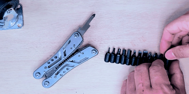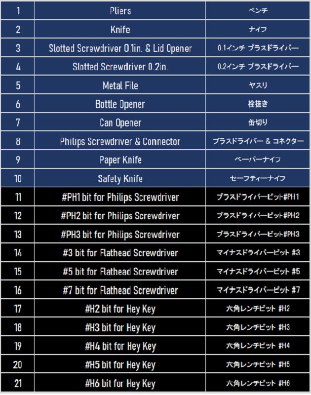 SWEENEY'S WARFIGHTERSマルチツールの特徴として11個ものビットが付いていることです。プラスドライバー用ビット×3 ( PH3, PH2, PH1, )、マイナスドライバー用ビット×3 ( 7, 5, 3, )、六角レンチ用ビット×5 ( H6, H5, H4, H3, H2, )。これらビットと本体を接続するのがマグネットコネクターです。強力なマグネット(磁石)がビットと本体を接続し、使用中ビットが外れることを防止する役割を持ちます。