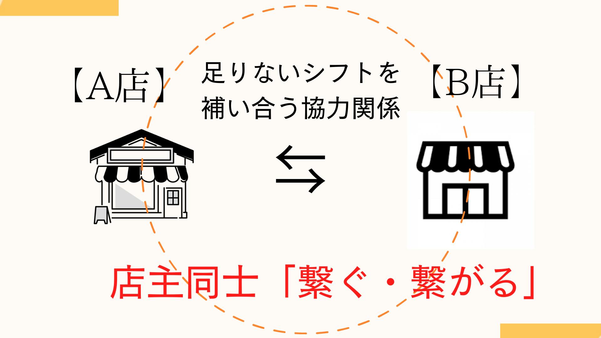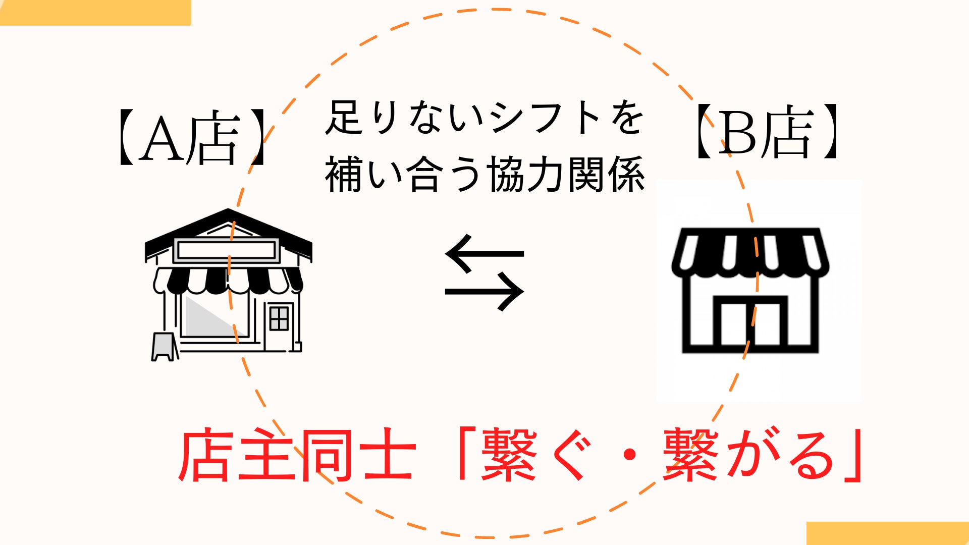 店主同士を繋ぎ、店舗間で1つの協力体制を作り、シフトの是正をするというものです。