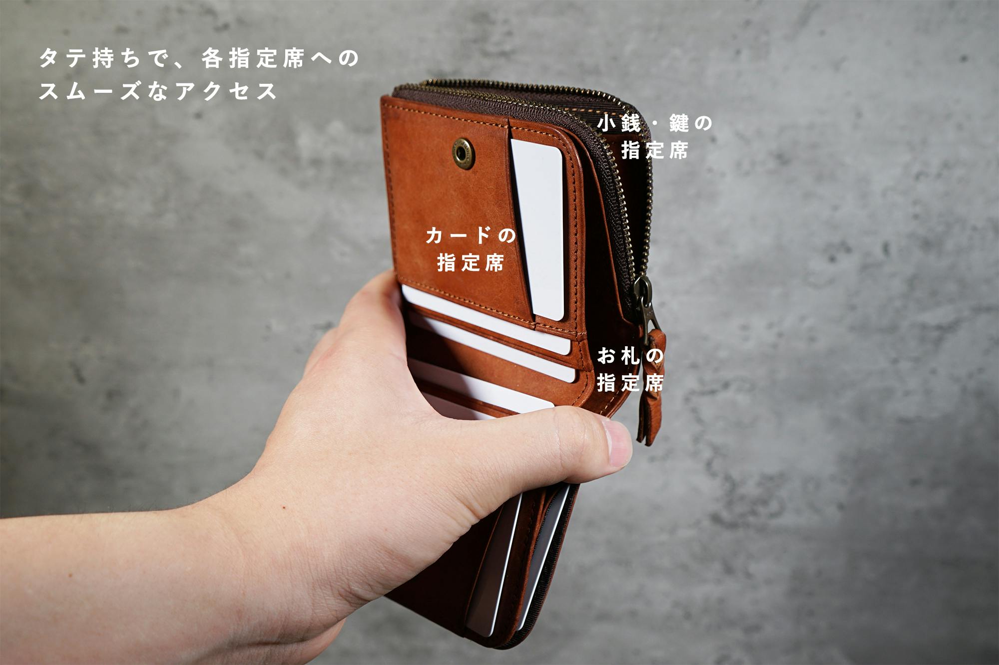 ラウンドファスナータイプよりも素早く開けることができるLファスナータイプ。小銭・鍵の指定席で、財布を閉じた状態でもファスナーを開くだけで小銭を取り出せます。カバっと大きく開き、中身が見やすく、取り出しやすい!鍵専用のポケットが2つあり、ファスナーを開けるだけですぐ取り出せます。