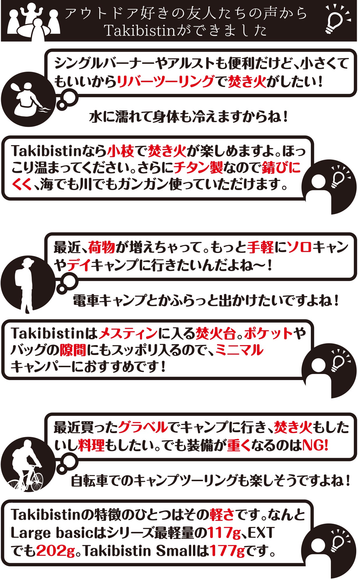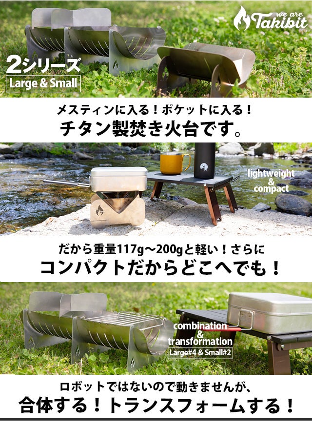 ・応募状況を確認しながら、迅速に発送するために商品を用意する予定ではありますが、 ご注文状況や使用部材の供給状況、製造工程の都合等により、出荷時期が遅れる場合があります。 ・皆様の応援購入により、量産効率が向上した場合、正規価格が販売予定価格より下がる可能性があります。・使用部材は国産のチタン、ステンレス、アルミです。価格変動と為替相場の影響を大きく受ける製品であることをご了承ください。・Takibistin Largeの底板は0.3ミリのチタンです。構造上鋭利になっている部分もございます。組立や分解の際には、手袋などを着用して怪我には十分お気をつけてください。・焚き火などで付いたススは、重曹などで取り除くことができますが、チタン特有の燃焼による酸化皮膜も取れる場合がございます。また繊細な加工を行っている箇所がございます。スポンジなどで磨いた時に力を入れすぎると変形したり怪我をするような場合がございます。十分にご注意ください。