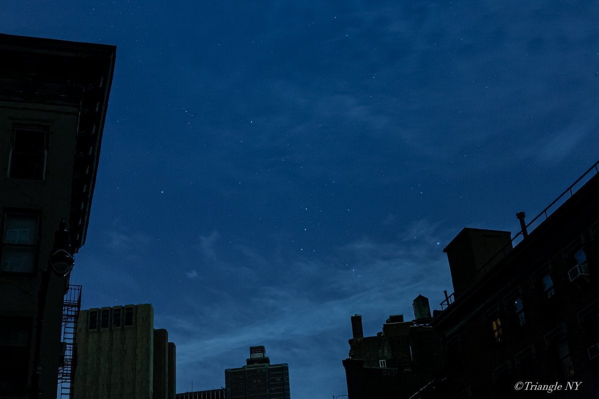 停電しているマンハッタンのビルディングの間から綺麗に見えるオリオン座
