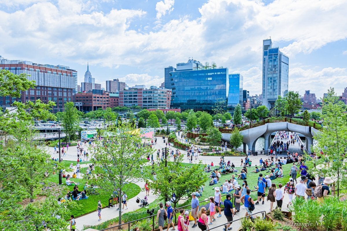 オープンしたての公園を楽しもうとする人々。