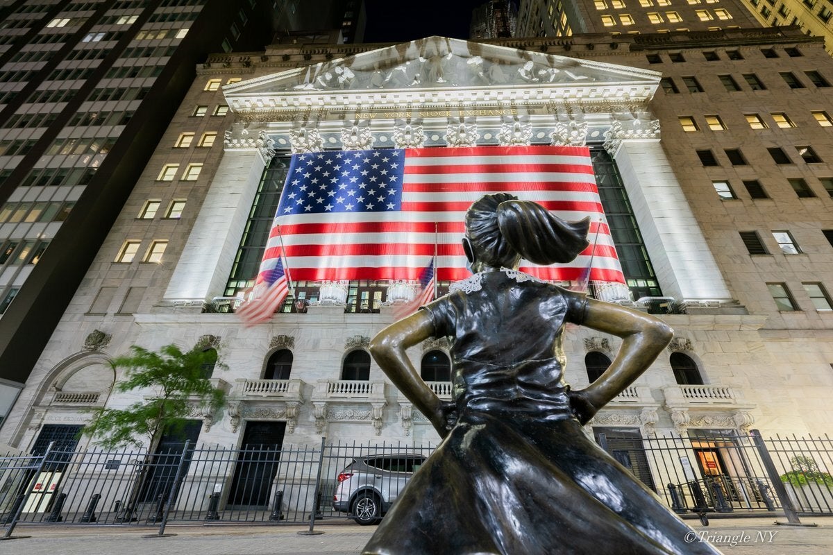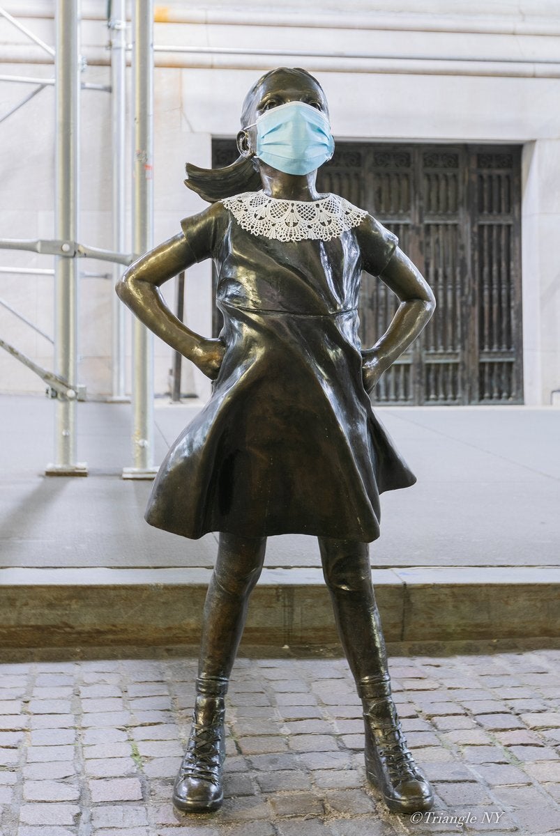 首にレース飾りをつけNYSEと対峙する”Fearless Girl”の1枚です。