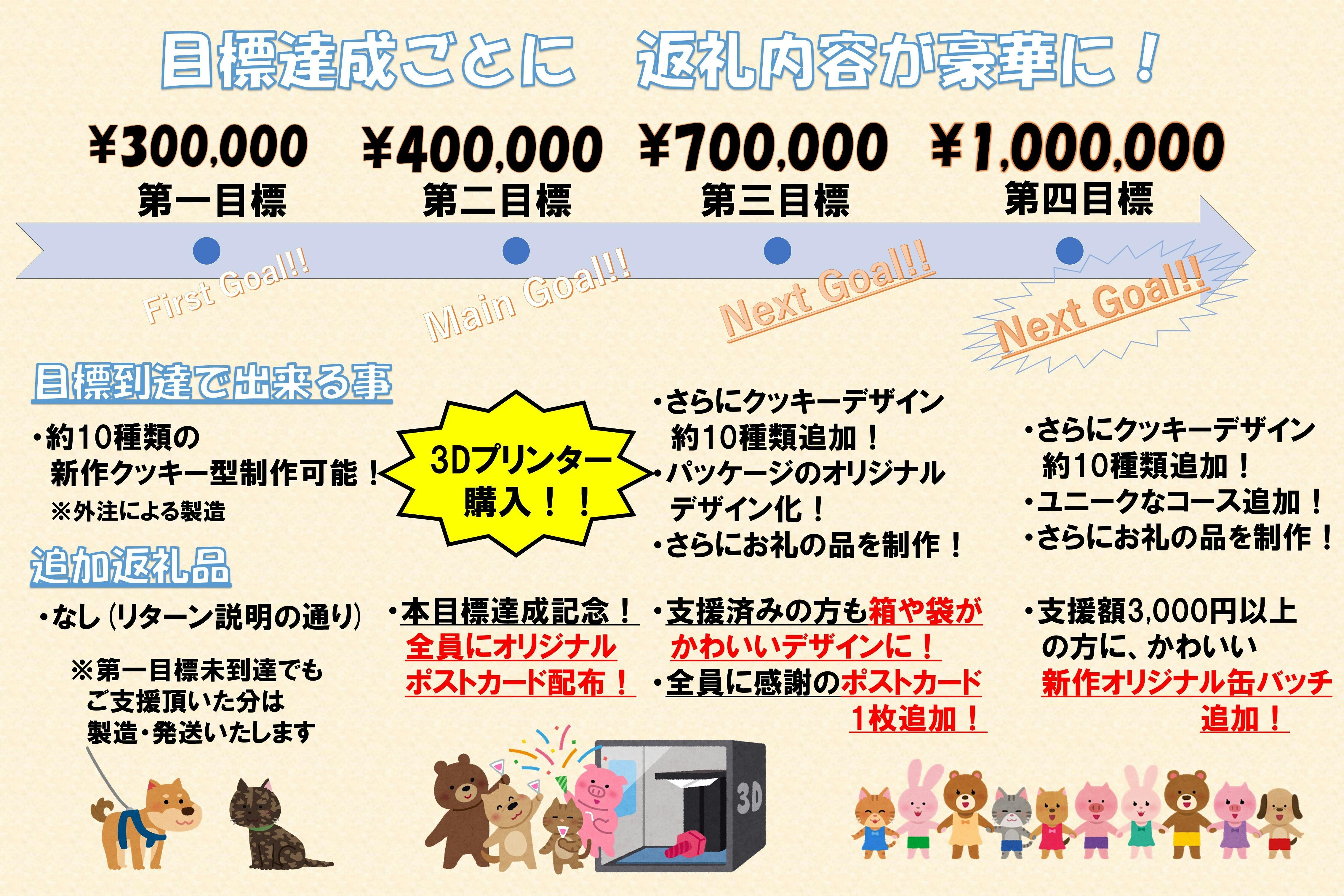 もし3Dプリンタ購入に至らなかった場合でも、本目標額に到達することで外注により新作クッキー製作、発送できます。