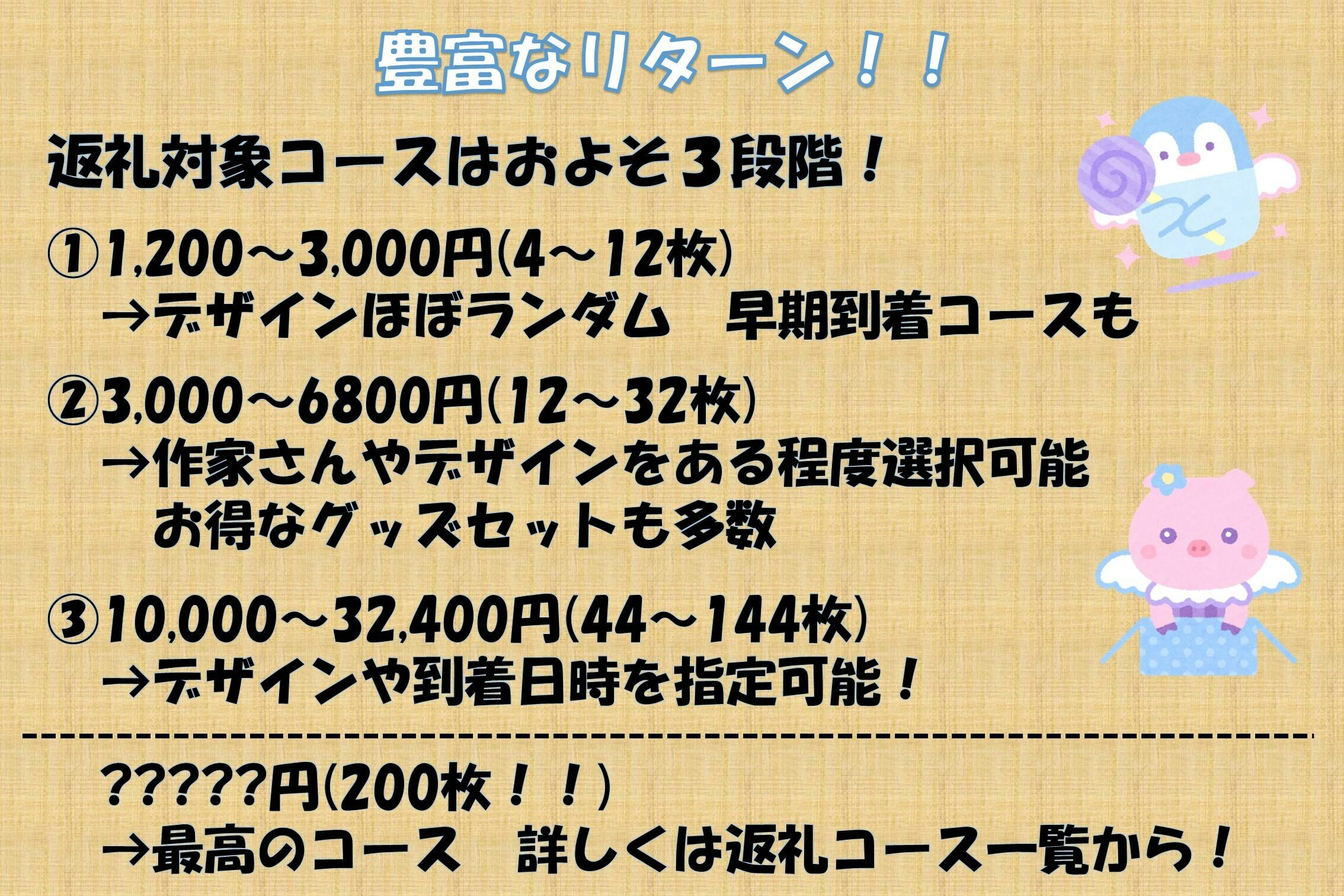 こちらのURLから、選択可能なコースと、発送対象のデザインの一覧表を拡大して見ることが出来ます。