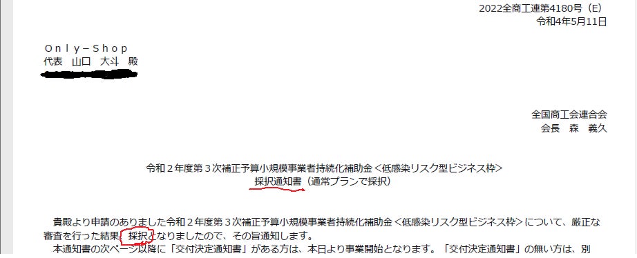 先日、当店が企画した事業計画が、「小規模事業者持続化補助金」に採択された通知を頂きました!