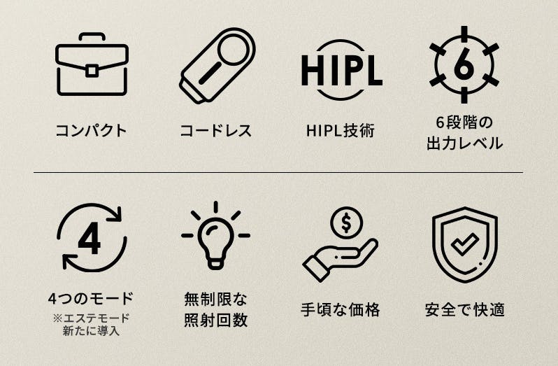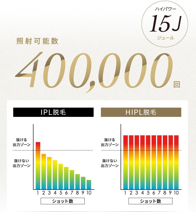 従来のIPL技術と比べ、サロン級HIPLパルス技術は周波が一定な効果を保たれ、使い続けることで段々と効果が落ちることはありません。長く効果的に続けられるアイテムになっています。また、ムダ毛ケアと美肌に効果のある2つの周波数帯を利用し、不用な周波数帯をフィルタリングすることで、使用するたびに大きな効果を感じることができます。