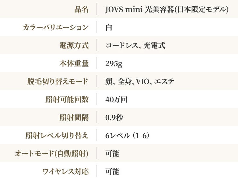通常サロンで全身脱毛すると30万以上費用がかかってしまいます。それに対してJOVS miniはご自宅で手軽にいつでもムダ毛ケアができ、さらに美肌ケア効果をプラスしました。