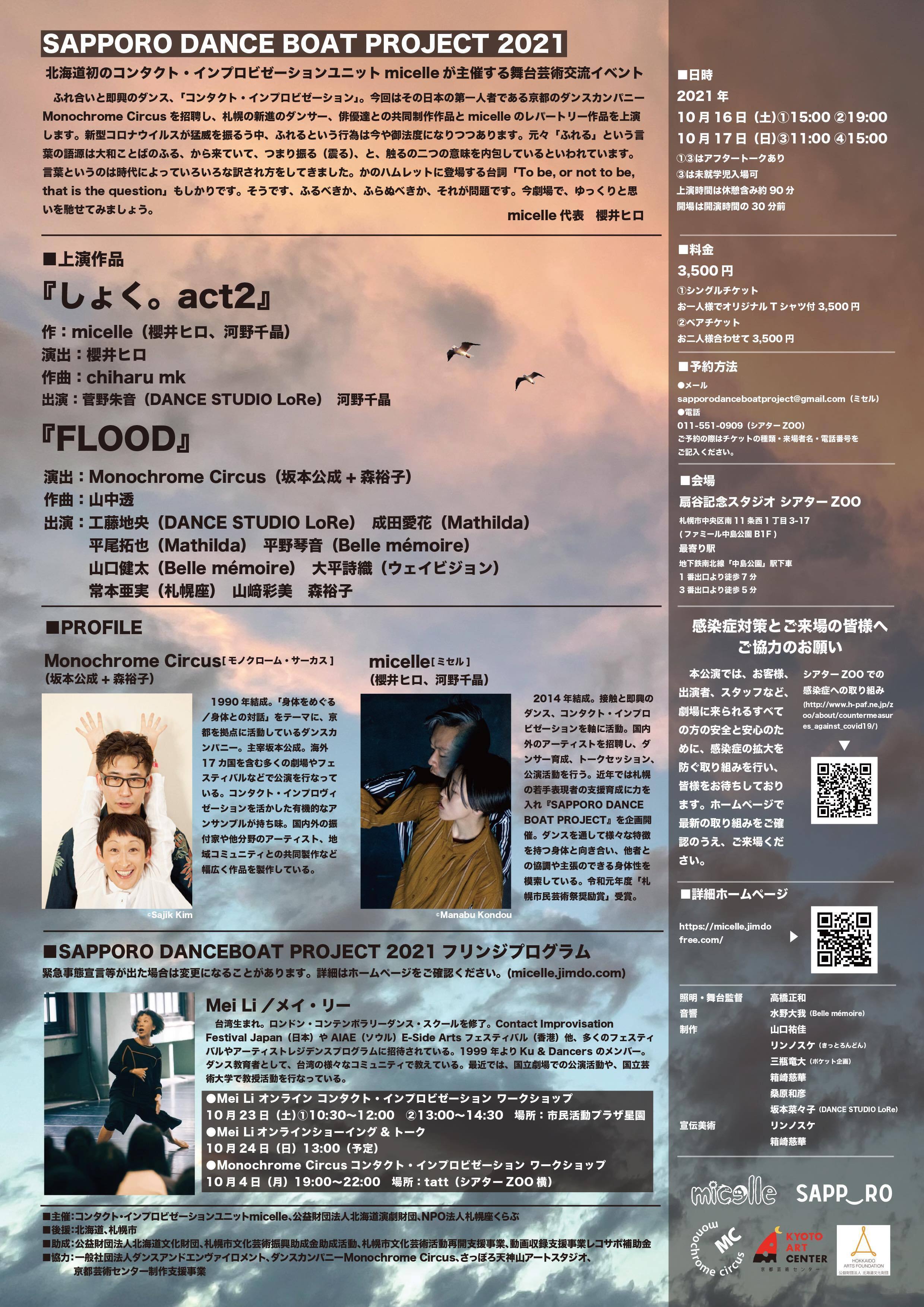 ■スタッフ 照明/舞台監督:高橋正和 音響:水野大我(Belle mémoire) 制作:山口祐佳、リンノスケ(きっとろんどん)、三瓶竜大(ポケット企画)、箱崎慈華、坂本菜々子(DANCE STUDIO LoRe) 宣伝美術:リンノスケ、箱崎慈華 ■主催:コンタクト・インプロビゼーションユニットmicelle、公益財団法人北海道演劇財団、NPO法人札幌座くらぶ ■後援:北海道、札幌市 ■助成:公益財団法人北海道文化財団、札幌市文化芸術振興助成金助成活動、札幌市文化芸術活動再開支援事業、動画収録支援事業レコサポ補助金 ■協力:一般社団法人ダンスアンドエンヴァイロメント、ダンスカンパニーMonochrome Circus、さっぽろ天神山アートスタジオ、京都芸術センター制作支援事業 ■SAPPORO DANCEBOAT PROJECT 2021フリンジプログラム 緊急事態宣言等が出た場合は変更になることがあります。詳細はHPをご確認ください。 micelle.jimdo.com ●Mei Li オンライン コンタクト・インプロビゼーション ワークショップ 場所:市民活動プラザ星園 10月23日(土)①10:30〜12:00 ②13:00〜14:30 ●Mei Liオンラインショーイング&トーク 10月24日(日)13:00(予定)