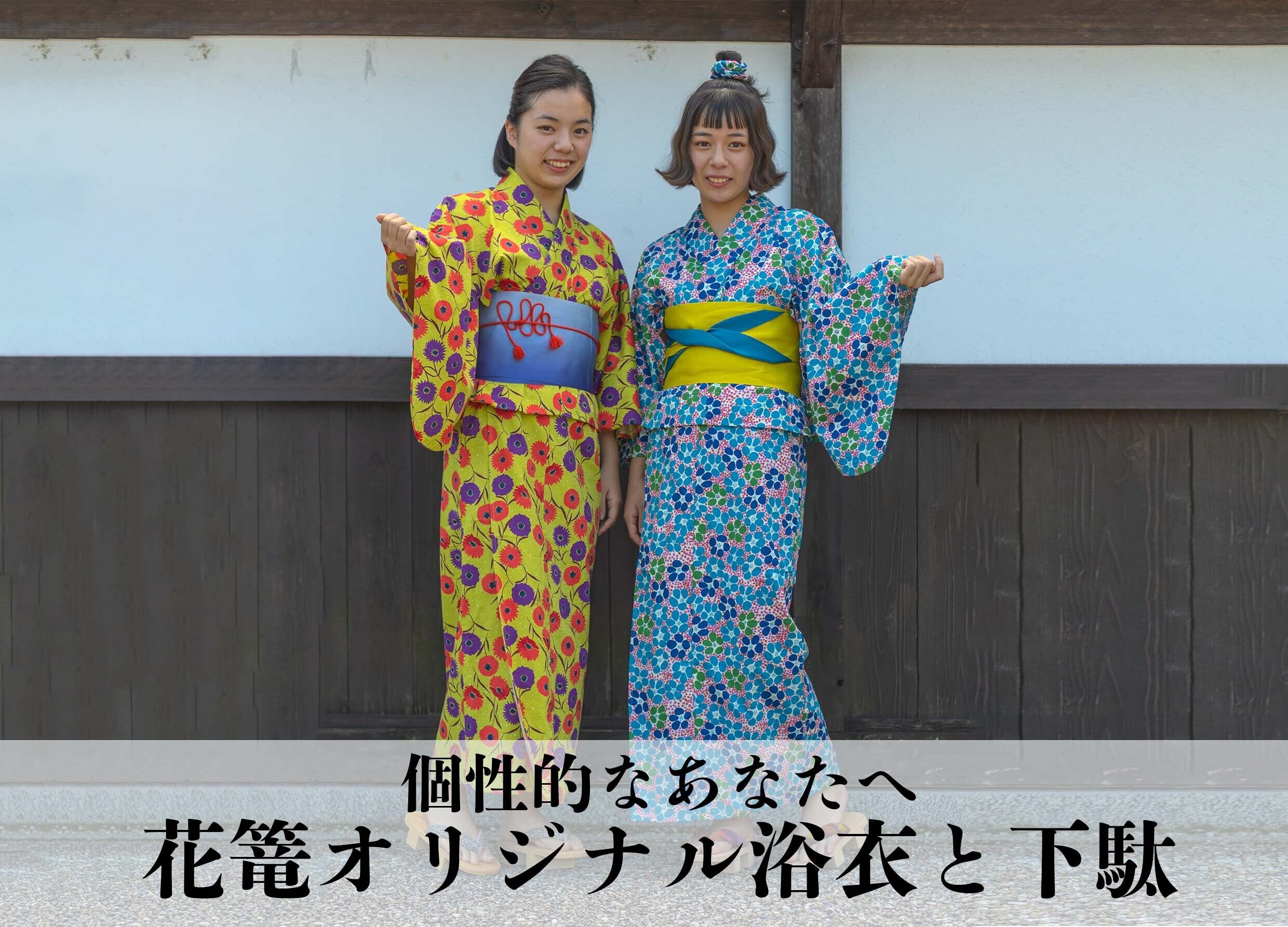 花篭オリジナル、簡単に着付けができる2部式浴衣と下駄をセットでオーダーでます。