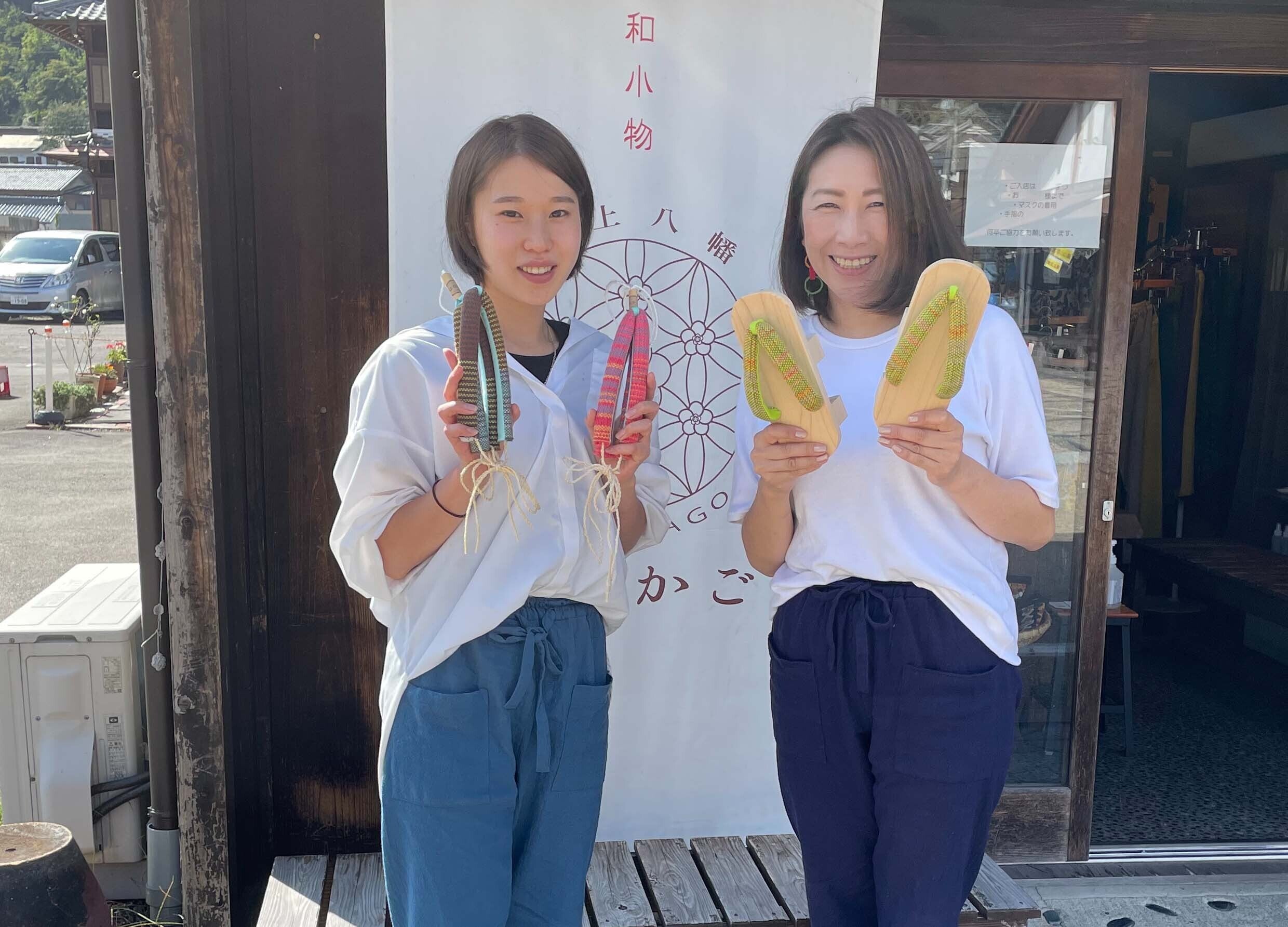 ”さき”と”英里子” 手に持つのは生地から郡上メイドの鼻緒花篭オーナーの英里子です!(写真右)