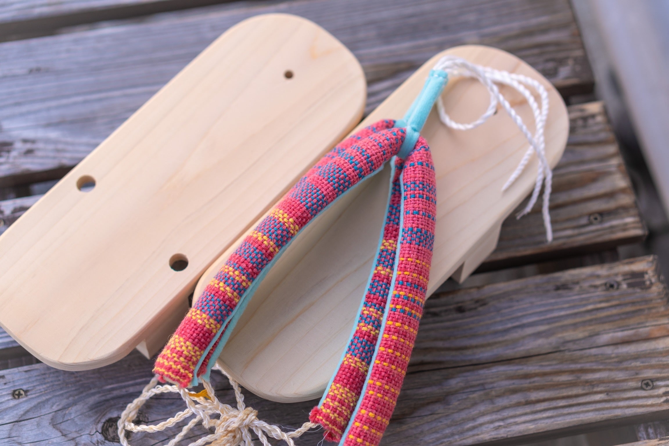 郡上産の鼻緒第一弾である、さをり織りの鼻緒を下駄にすげてお送りいたします。