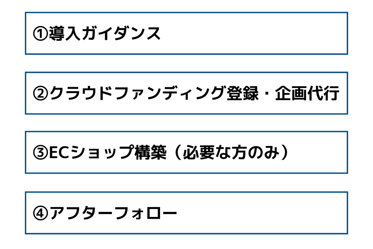 クラウドファンディングが終了しECショップが立ち上がった後も、④販売価格や顧客管理についてのアフターフォローを行いますのでご安心下さい。