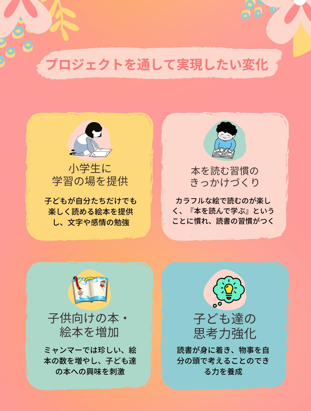 新型コロナウイルスとクーデター後の情勢悪化により、ミャンマーでは小中高校が1年半以上閉まっています。ミャンマーにおいて、子ども達の自宅学習方法は非常に限られ、勉強したくても勉強できず、子ども達は困っています。絵本をミャンマー語に翻訳し、各家庭に届け、楽しみながらも学習できる方法を提供したいです。