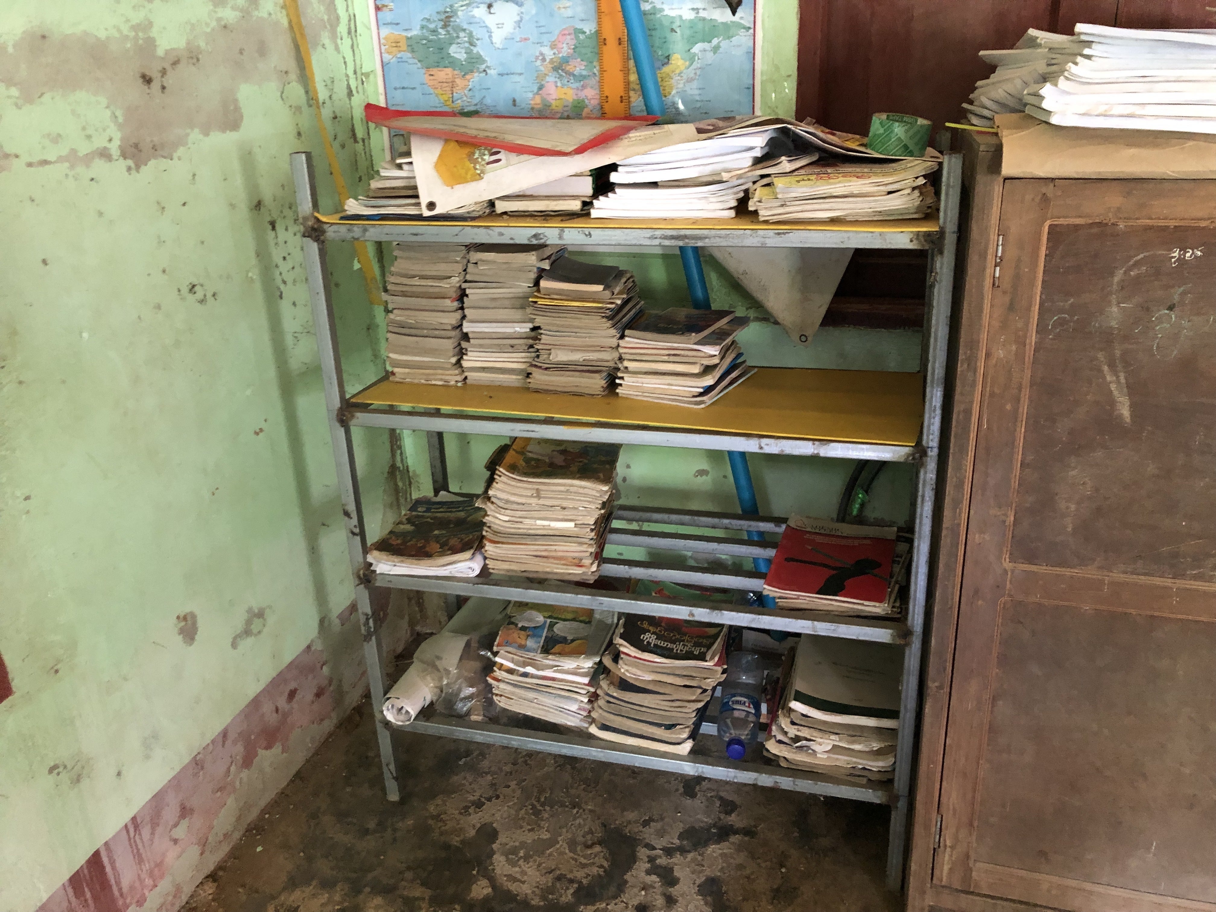ミャンマーの学校には図書館はあまりません。近年、図書館活動の啓発が行われ、本を読む習慣を子供たちにつけさせようという動きがみられますが、まだまだ実際に活動に起こせていません。私が普段いっている学校の一つの本コーナーはこちらです。