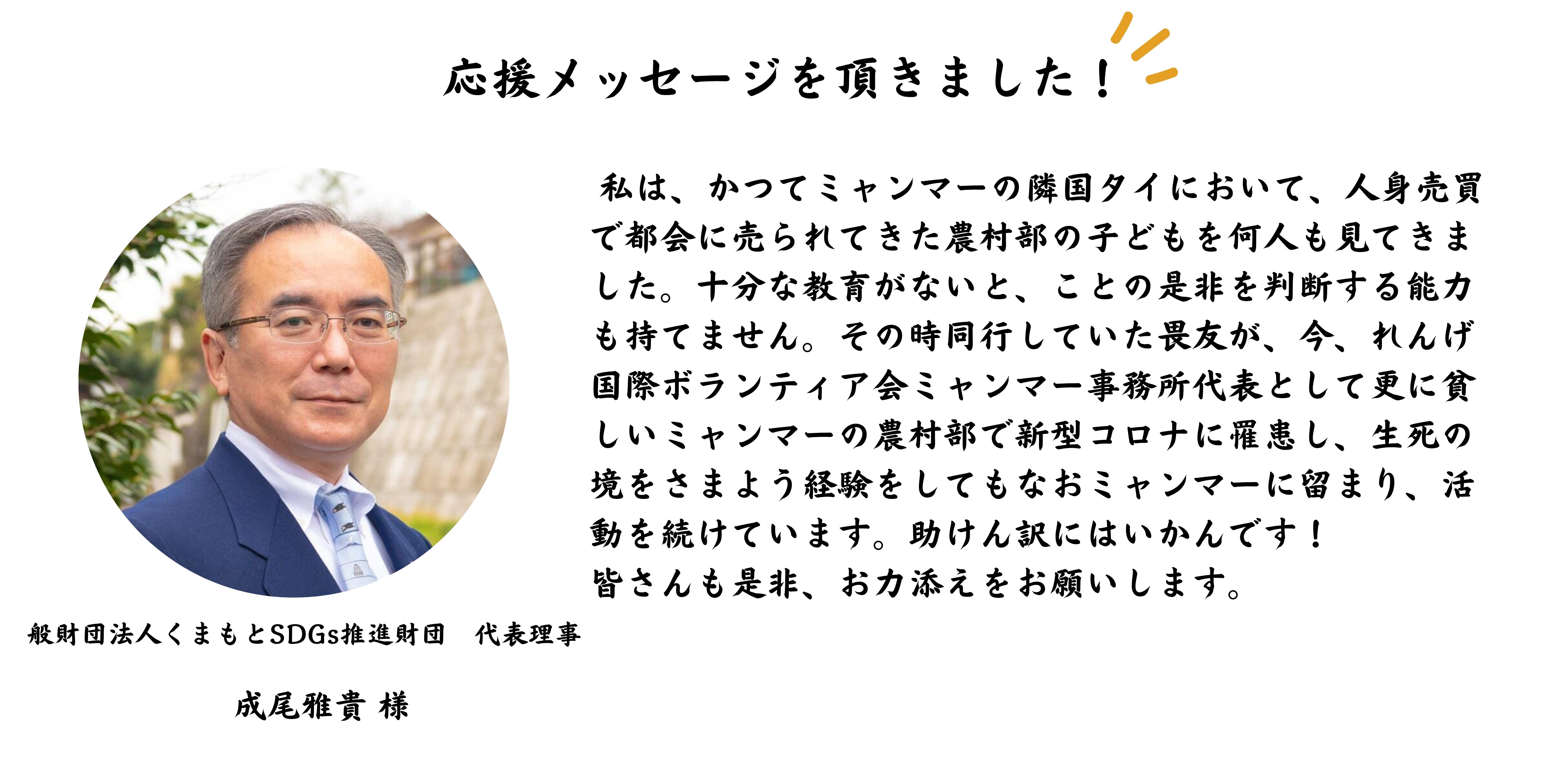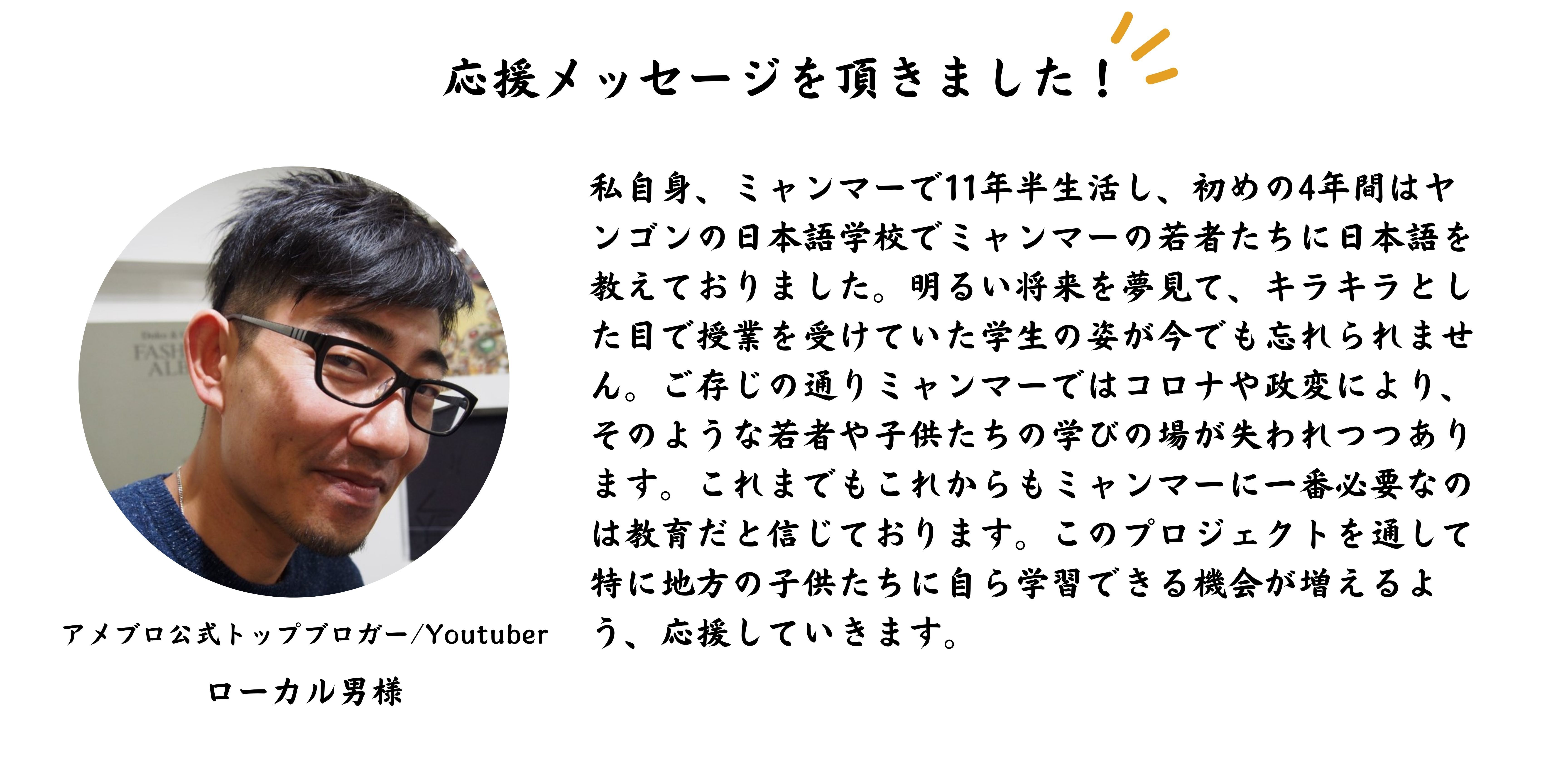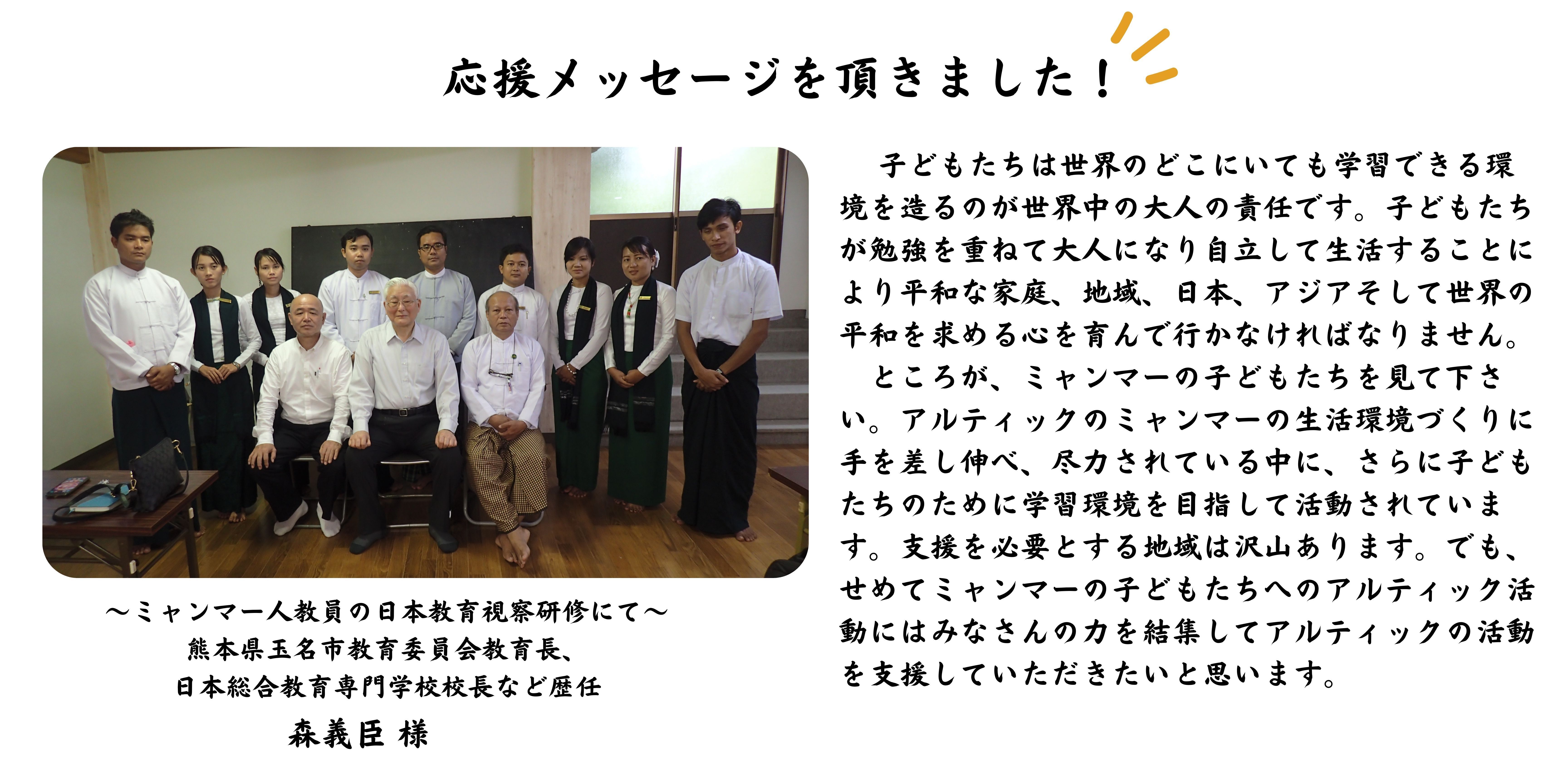 私は、毎日学校に行き、教室で学び、友達と遊び、帰りに図書館や公民館で本を借りて帰っていました。『勉強』をすることになんの障害もなく、毎日平和に暮らしていました。この日本での『あたりまえ』がミャンマーにはありません。教育は子供たちにとって、かけがえのないものです。そして子ども達はミャンマーの未来です。どうか、ミャンマーの子ども達の教育の灯を消さないよう、ご協力をお願いします。