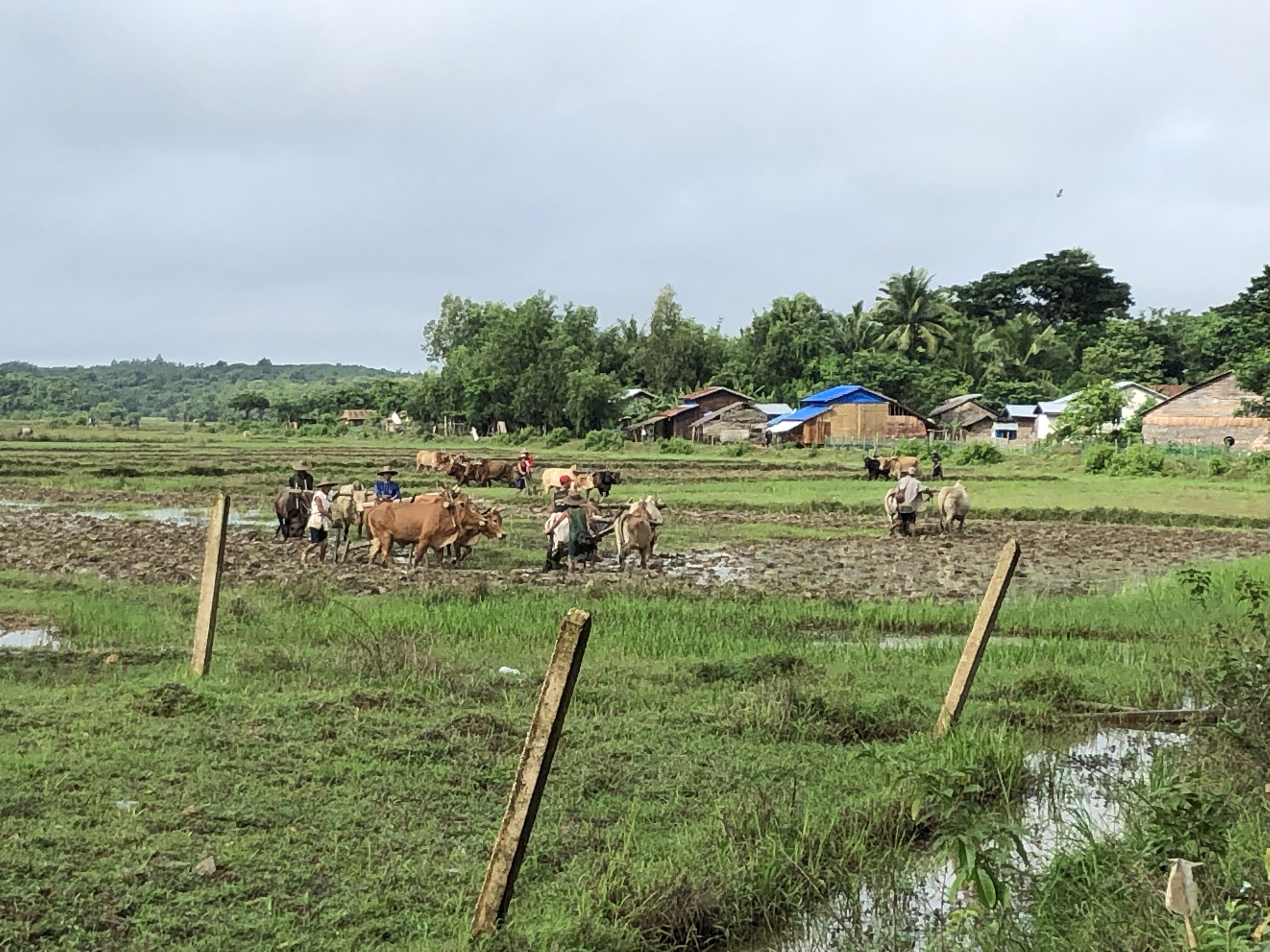 ↑ターヤーゴン校周辺 (村人が協力して学校農園の田んぼを耕す様子)