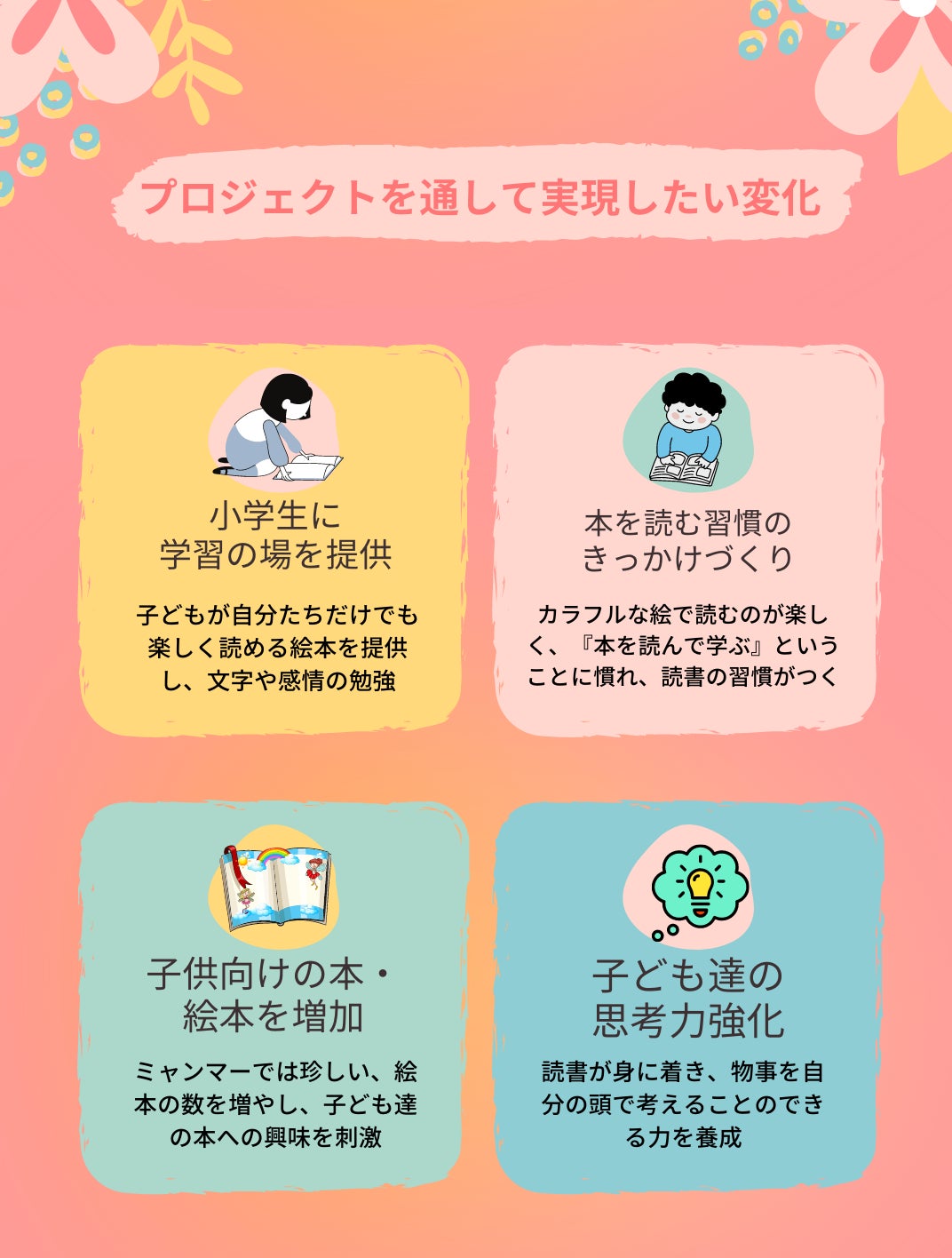 コロナとクーデターにより、学校に行きたくてもいけない。オンラインで勉強したくても電気が通っておらず、勉強の仕方がわからない。家でも自分たちで楽しみながら学習できる『絵本』を家庭に届け、子ども達に教育の灯を!