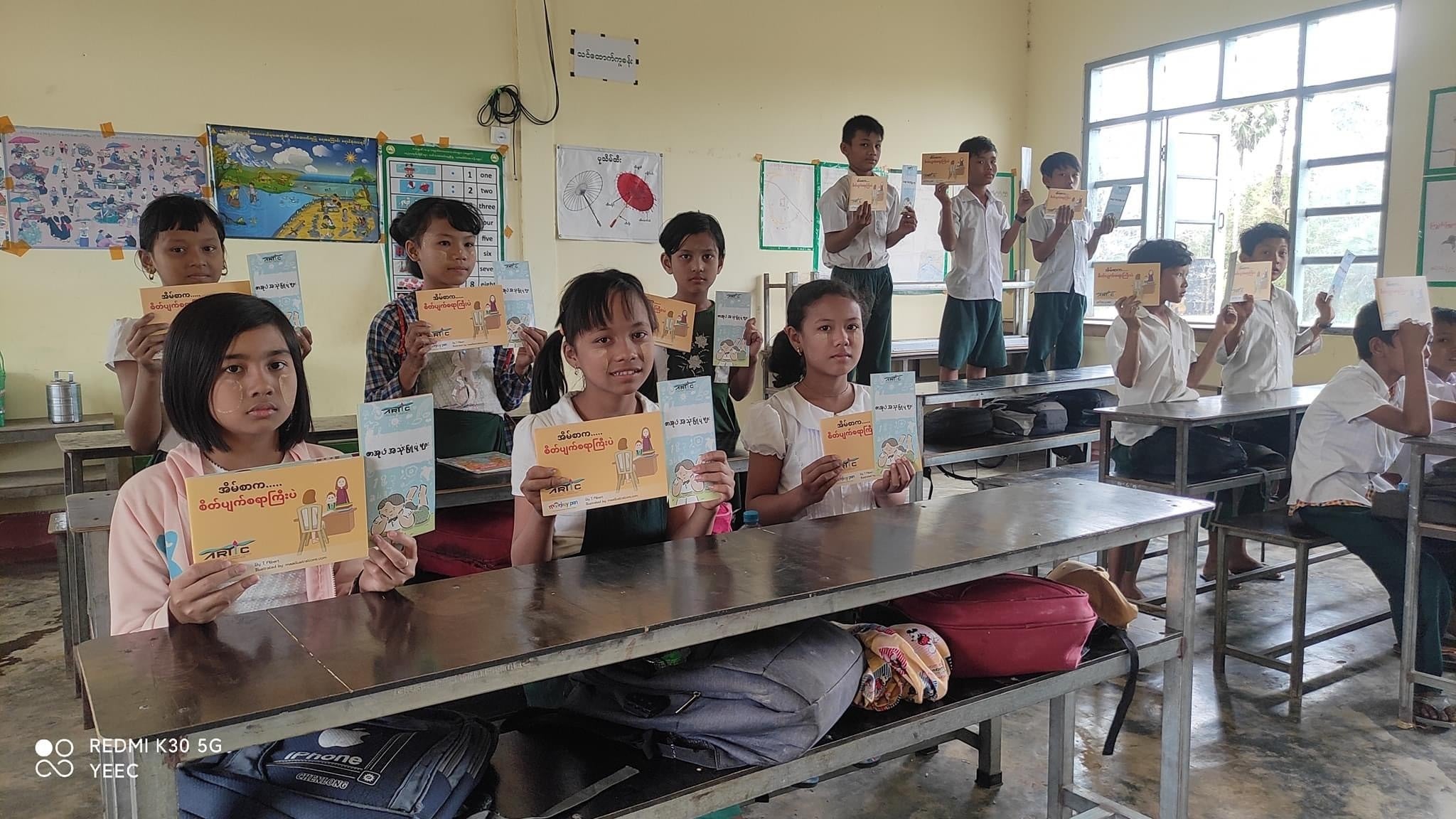 2022/01/09 14:39皆さん、明けましておめでとうございます。昨年は大変お世話になりました。今年もどうぞよろしくお願いいたします。\絵本の見本が届きました/昨年は、皆様の多大なるご寄付により、政情不安で学校に行けない子どもたちのための資金を調達することができました。子どもたちの教育の大切さを理解してくださっている皆様のおかげで、私たちはプロジェクトを実施することができます。改めて心よりお祈り申し上げます。受け取った本の見本はこちらです(*^-^*) 絵本2冊、感想を書くコメントブック1冊、本の管理方法についてのハンドブックを子どもたち一人ひとりにお届けする予定です。残念ながら、ミャンマー国内物価上昇により本の数の変更と、スケジュールに遅れがでていますが、近日中に子どもたちに届けられるように準備しています。前回お伝えしたように、絵本の配布は、学校の委員(村人)と高学年の生徒が担当しており、現在名簿を揃えており、1月後半にまずは10校にお届けする予定です。今回は少し、ミョウハウン校でのプロジェクトの準備の様子をご紹介します。学校委員会と、だれがどの地域を担当するか話し合い、どのように本を届けるかを話し合いました。当初は、子どもたちが読んだ絵本を学校の図書館に寄贈してもらう予定でしたが、政治的な理由で学校訪問をためらう生徒もいるようです。そこで、配布後2カ月が経過した時点で、担当者がいるところに委員会が回収に伺うことにしました。これからのスケジュール①委員が子どもたち(政治的な理由で学校に行けない子も含む)一人ひとりに絵本を配る。その際、パンフレットを使いながら、子どもたちに本の扱い方を指導します。②子どもたちは絵本を読み、コメントブックにコメントを書いたり、絵を描いたりします。③全児童から絵本を回収し、5冊読んで感想や絵を書いた児童からコメント帳を受け取り、コンテストに参加。④委員会が絵本と感想文を各担任に提出。⑤先生方が入賞者を決定します。⑥ARTICは、絵本と引き換えに賞品を提供します。このように行うことで、来年もエーヤワディ地域のさまざまな学校や村で、同じような絵本プロジェクトを実施することができ、一人でも多くの子ども達に絵本の楽しさを広めることができます♪次回は、配布後の様子をお伝えします! もっと見る