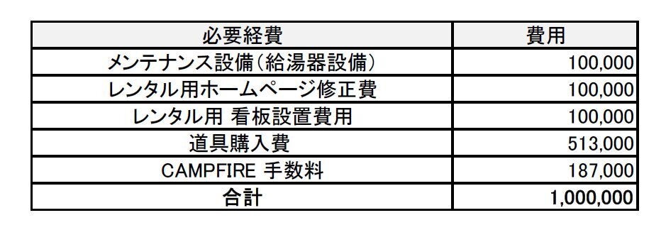 今回のレンタルサービスを始めるにあたり、キャンプ道具一式、ホームページの整備費、道具のメンテナンスの為の設備費用として合計100万円程度が必要です。しかし、コロナ禍の厳しい経営状況の中、なかなかその資金が捻出できないため、どうか、皆様に、ご支援をして頂きたく、お願い致します!