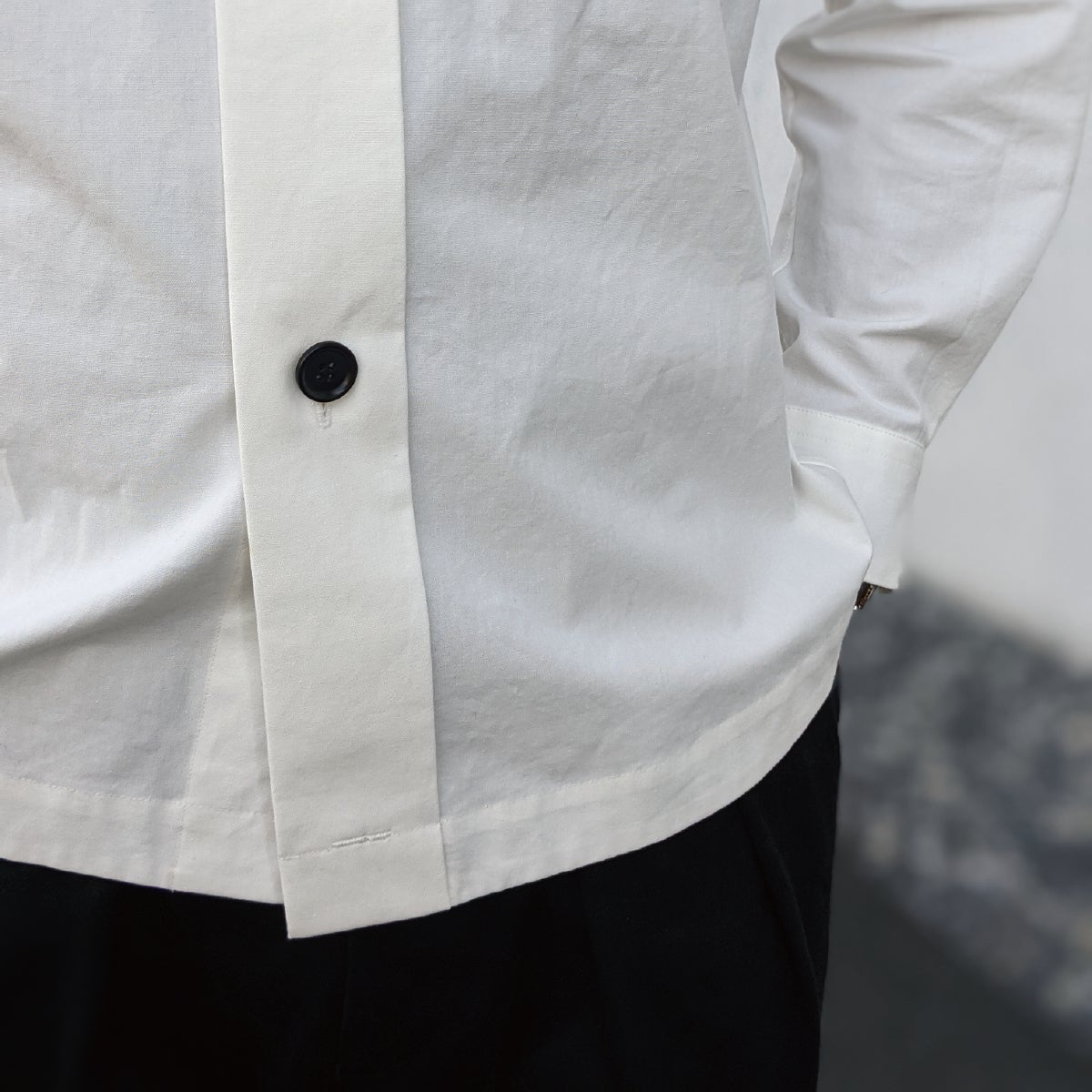 こちらのアイテムの特徴は前立てで、幅を5cmと広めに設定し、通常のシャツとは異なり外側に折り返されています。