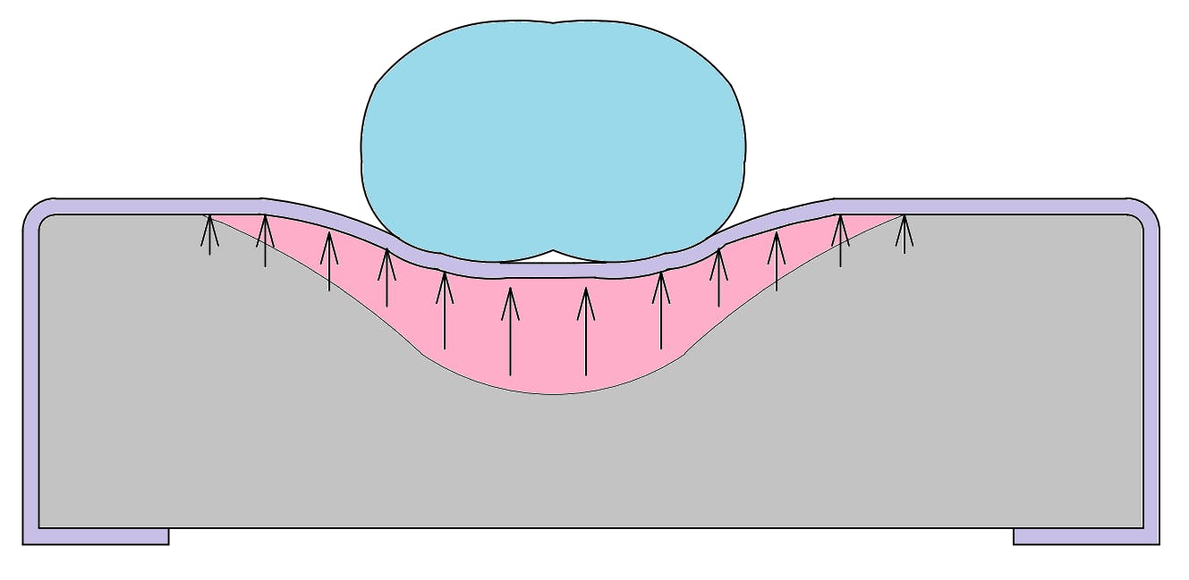 同じマットでも応力を分散させれば、身体の真下の応力は小さくなるので沈み方も浅くなるはず 。