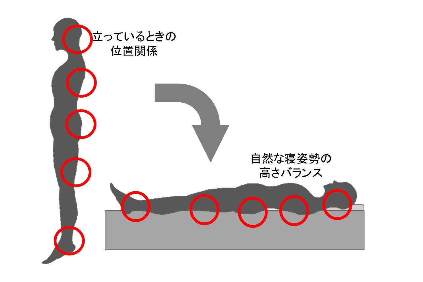 快適寝姿勢には、頭・背中・腰の位置が大切です。理想的なのは「立っているとき」と同じ姿勢。よくあるお尻の沈みすぎは寝姿勢を歪め、腰痛や寝返り不足でベッドで寝るのが辛くなるほどです。